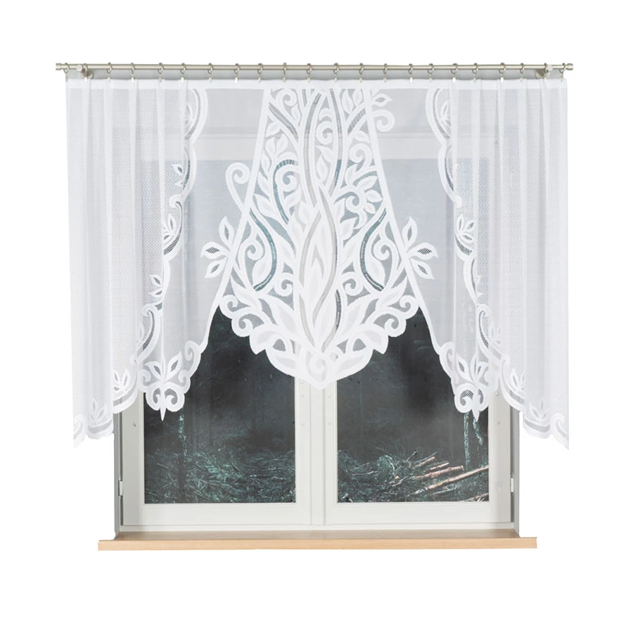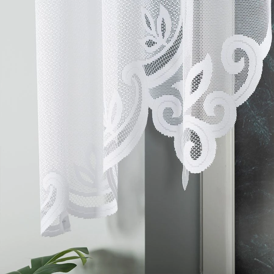 POLA to gotowa firanka żakardowa, która łączy dekoracyjność z subtelną lekkością. Jej kompaktowy rozmiar 250x130 cm po zmarszczeniu idealnie pasuje na okno o szerokości ok. 125 cm – doskonały wybór do kuchni, jadalni lub mniejszych salonów.