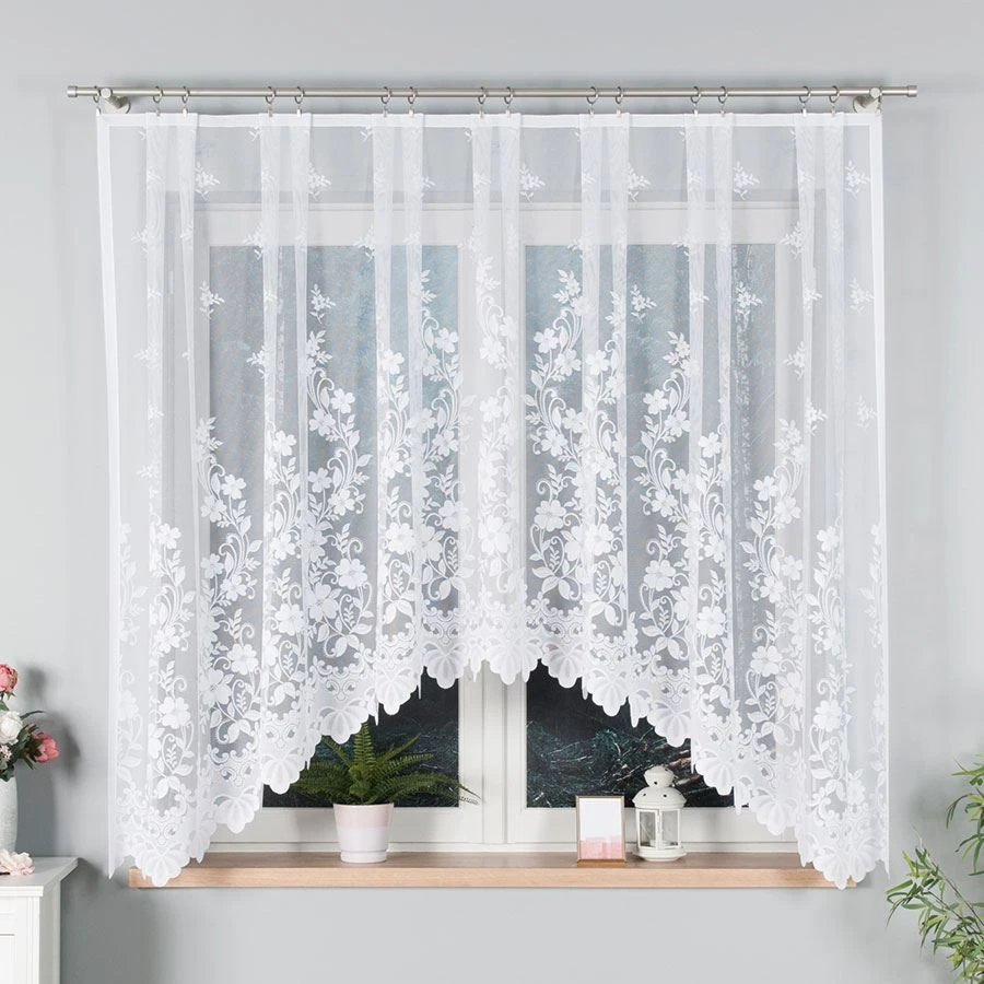 LUDWIKA w rozmiarze 310x160 cm to gotowa firanka żakardowa z dekoracyjnym wzorem kwiatowym i ozdobnym podcięciem w dolnej części. Zawieszana na żabki – bez taśmy marszczącej – idealnie nadaje się na okno o szerokości ok. 155 cm po zmarszczeniu.