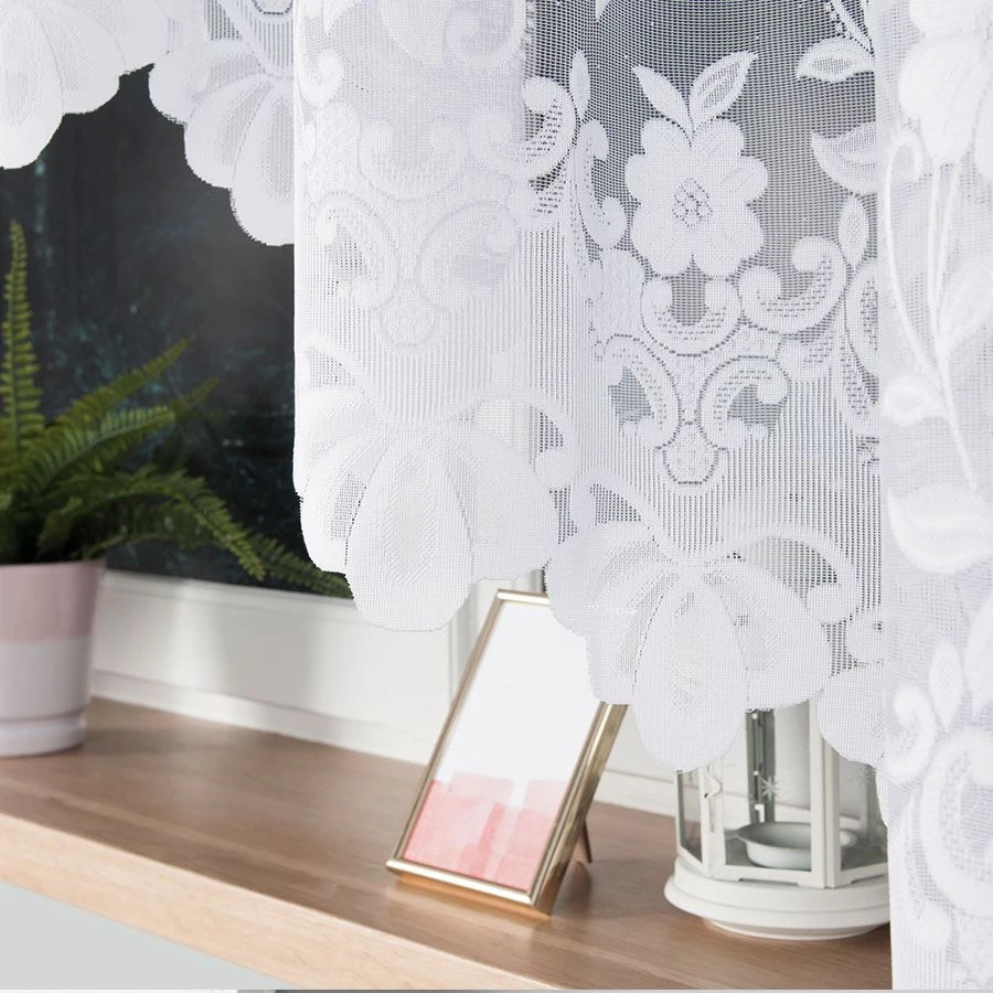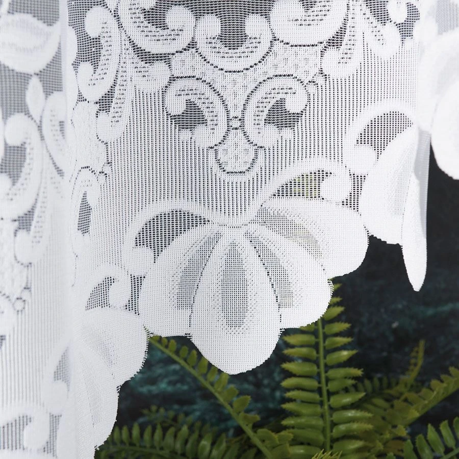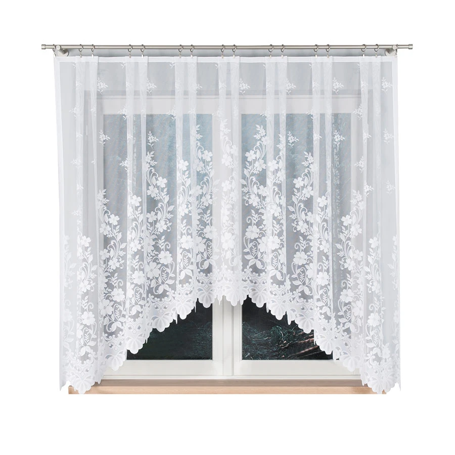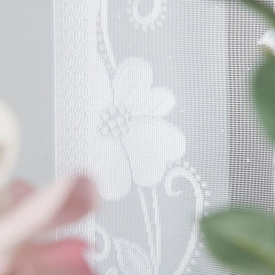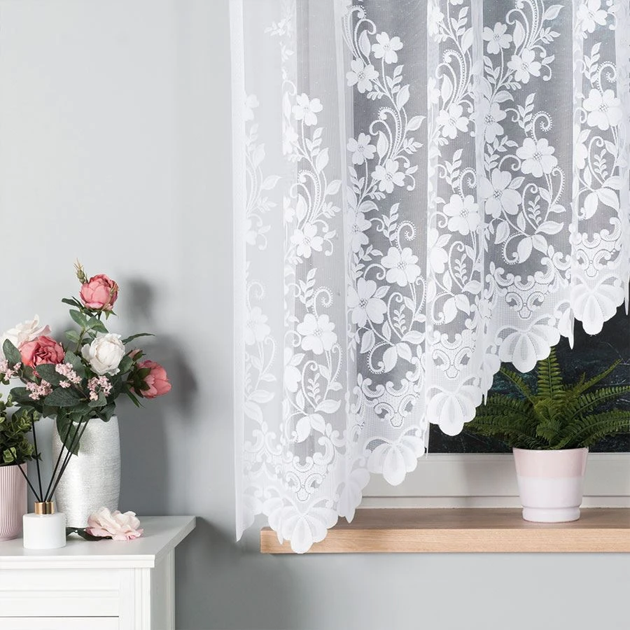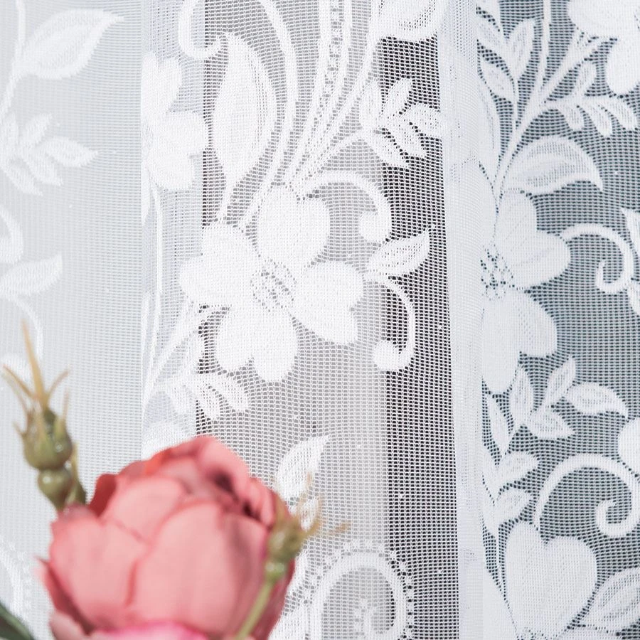 Wykonana z delikatnego, białego żakardu o gęstym splocie, firanka pięknie rozprasza światło i dodaje pomieszczeniu jasności oraz elegancji. Wyrazisty kwiatowy wzór oraz ozdobna dolna krawędź tworzą spójną i estetyczną kompozycję.