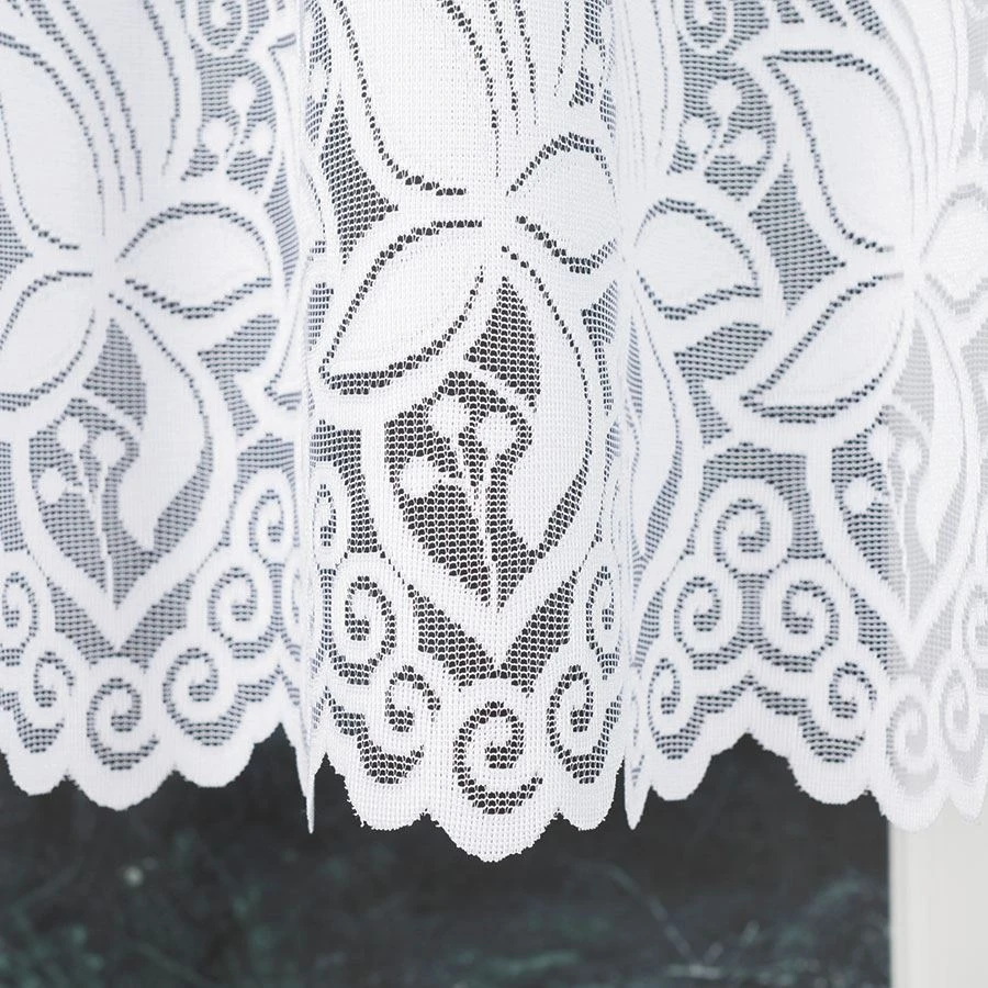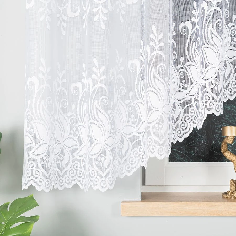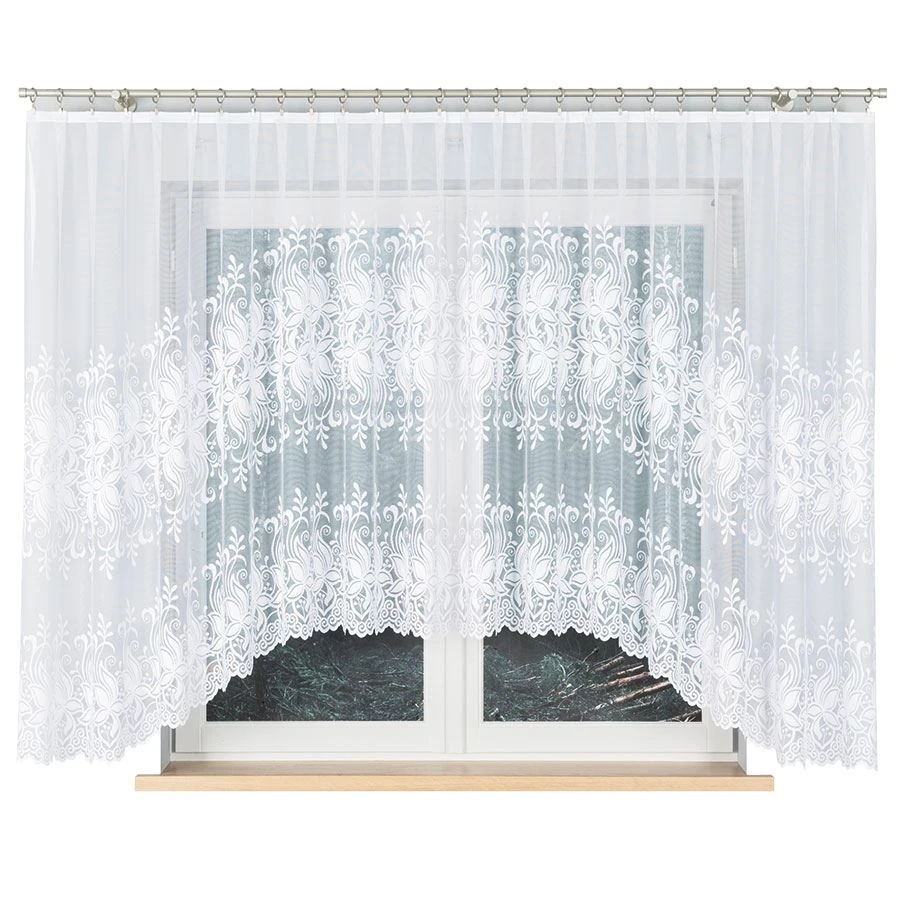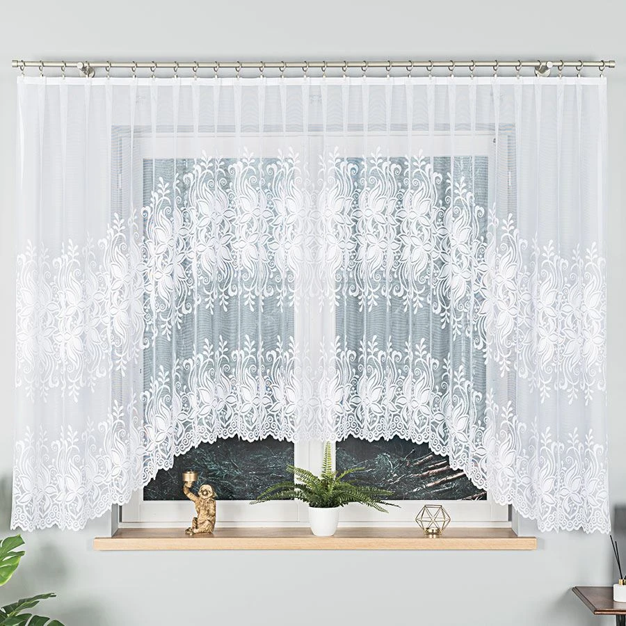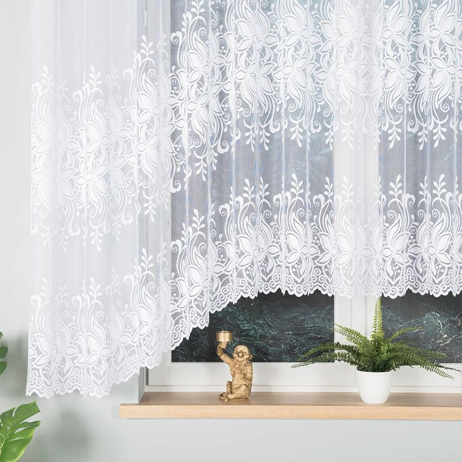 JOANNA w rozmiarze 400x160 cm to propozycja dla miłośników klasyki w nowoczesnym wydaniu. Firanka wykonana z wysokiej jakości białego żakardu zachwyca subtelnym, kwiatowym wzorem oraz pięknym, dekoracyjnym podcięciem na dole, które dodaje jej lekkości i wdzięku. Idealnie sprawdzi się jako dekoracja szerokiego okna w salonie, kuchni, jadalni czy sypialni, wprowadzając do wnętrza delikatność i elegancję.