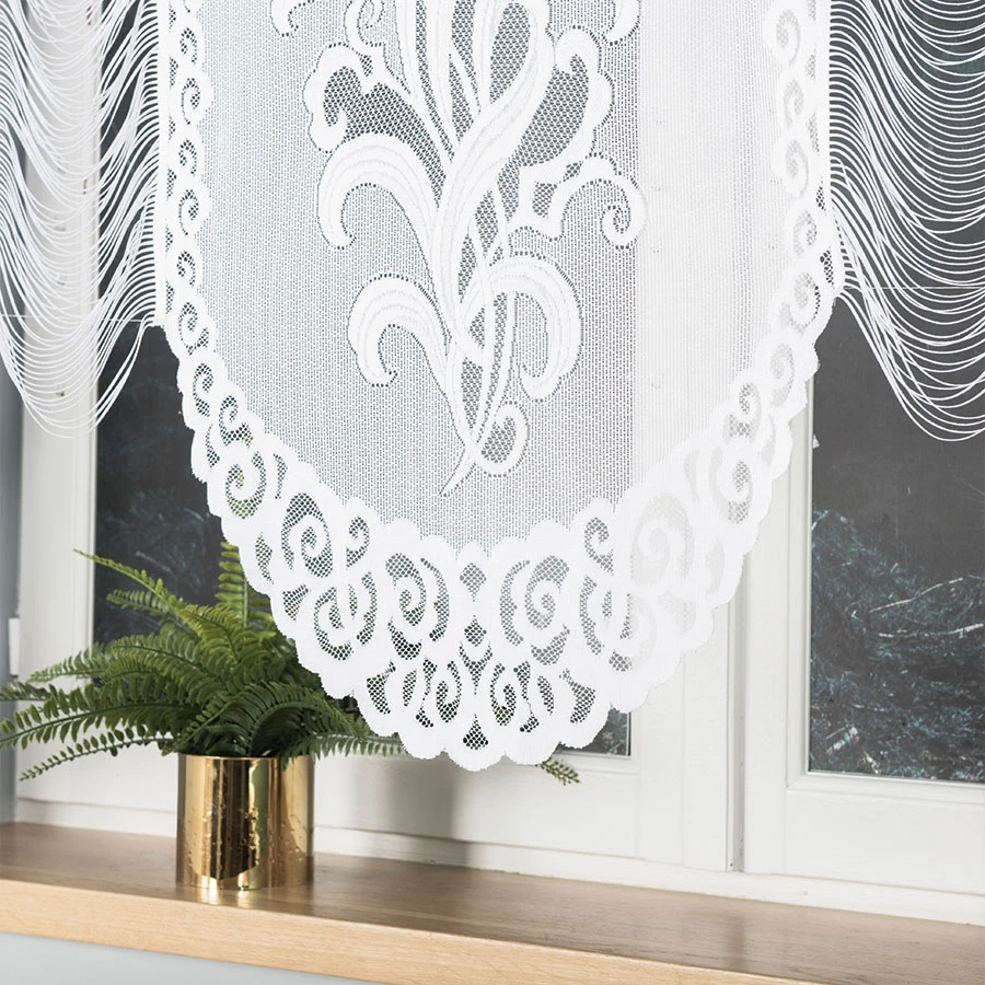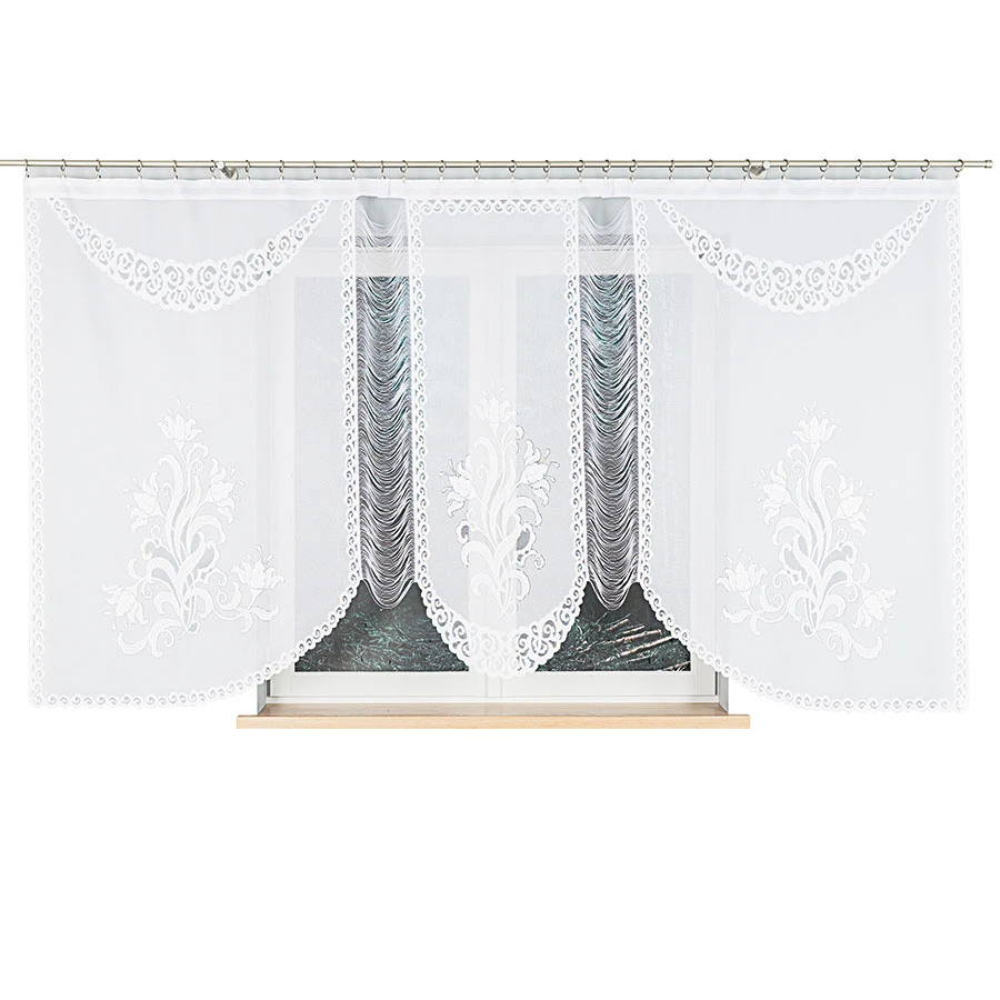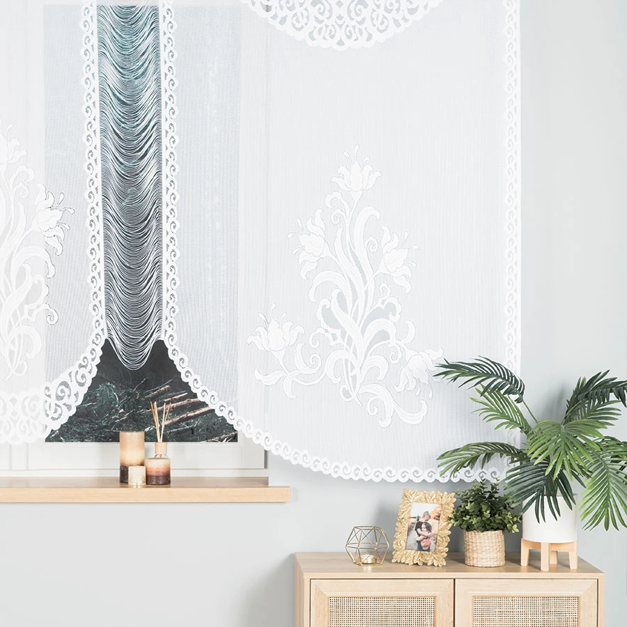 Firanka BOGNA to klasyczna elegancja w Twoim domu! 🌿 Jej piękne, żakardowe zdobienia w kwiatowe motywy oraz efektowne podcięcie na dole tworzą wyjątkowy, romantyczny klimat w każdym wnętrzu. Śnieżnobiała tkanina subtelnie przepuszcza światło, optycznie rozświetlając przestrzeń.