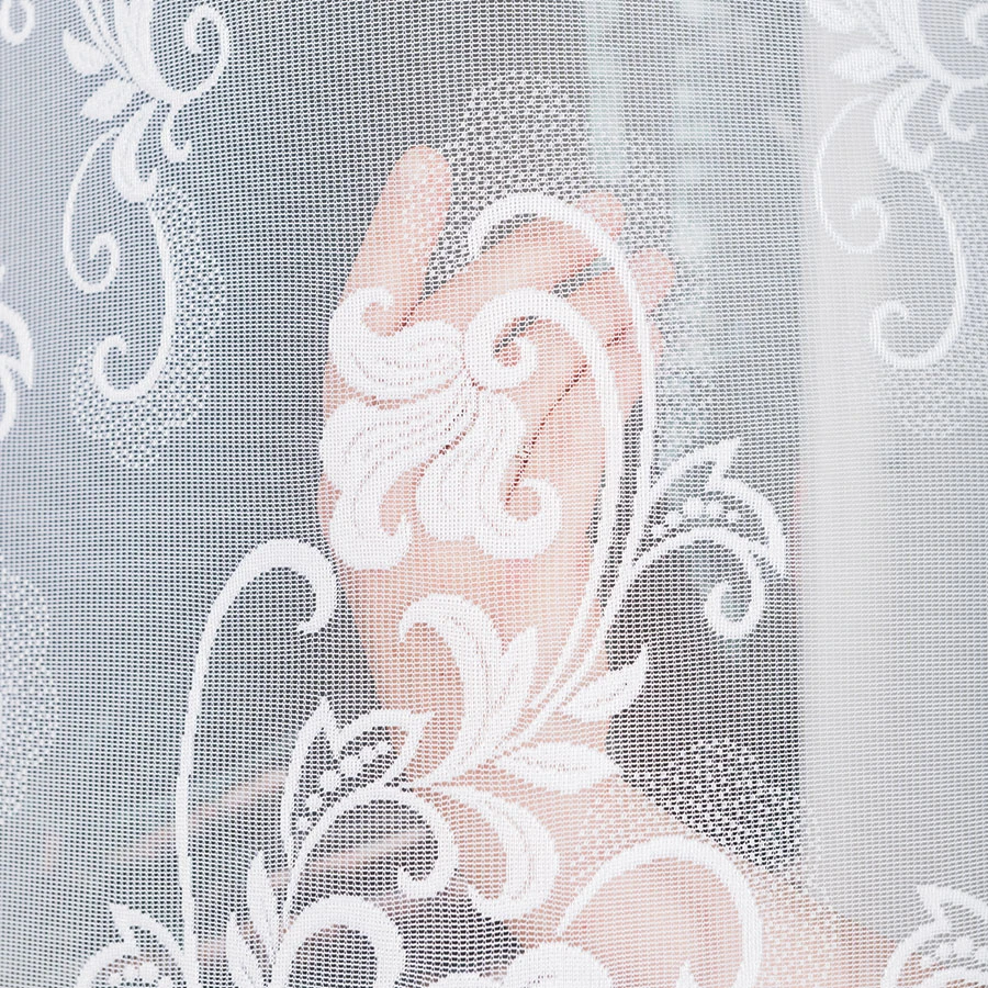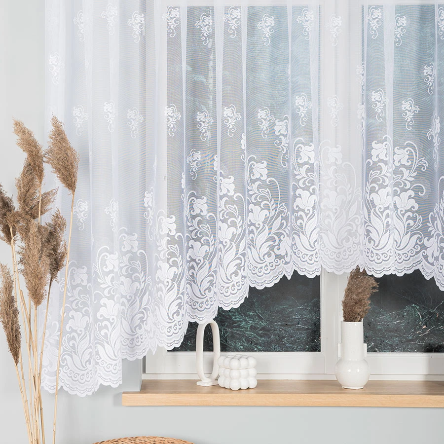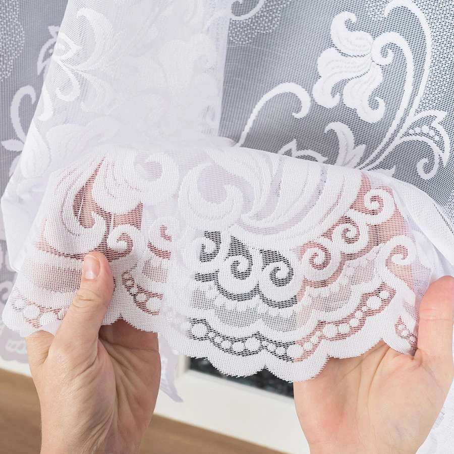 Firankę zdobi gęsty roślinny wzór – liście i subtelne kwiatowe motywy 🌿🌼 rozciągają się od dołu ku górze, stopniowo przechodząc w lekką, transparentną siateczkę. Taki efekt zapewnia więcej światła dziennego 🌞, jednocześnie dając poczucie intymności.
