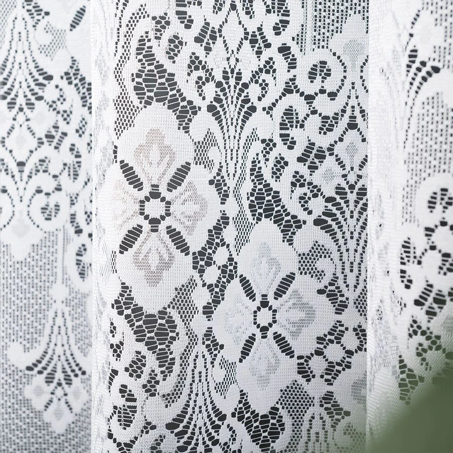 Firanka wykonana jest z białego żakardu – materiału znanego z trwałości, odporności na zagniecenia i doskonałego układania się na oknie. Jej największą ozdobą jest bogaty, kwiatowy wzór, który nadaje jej stylu retro i romantyzmu, a jednocześnie sprawia, że wpisuje się w aktualne trendy wnętrzarskie.