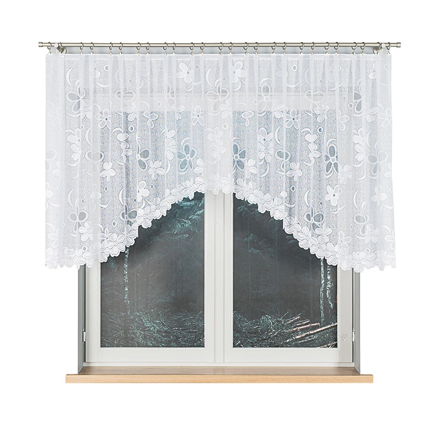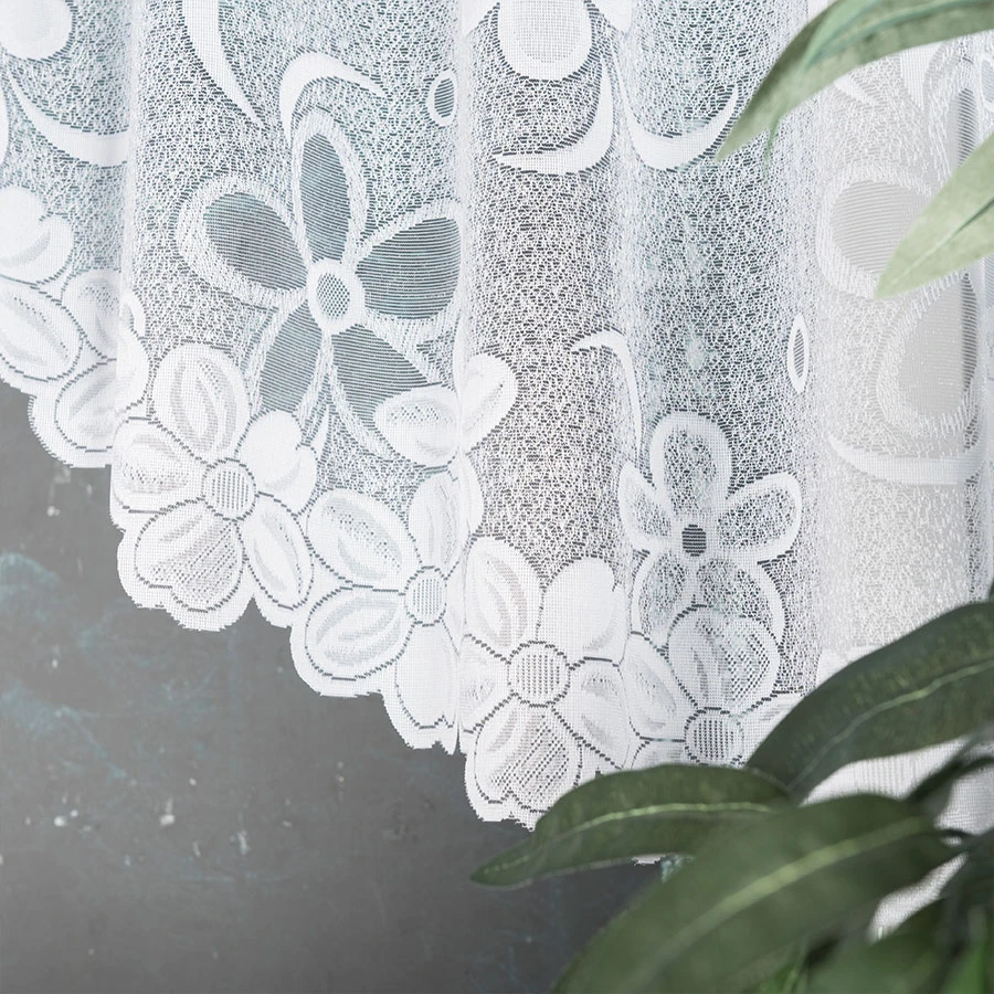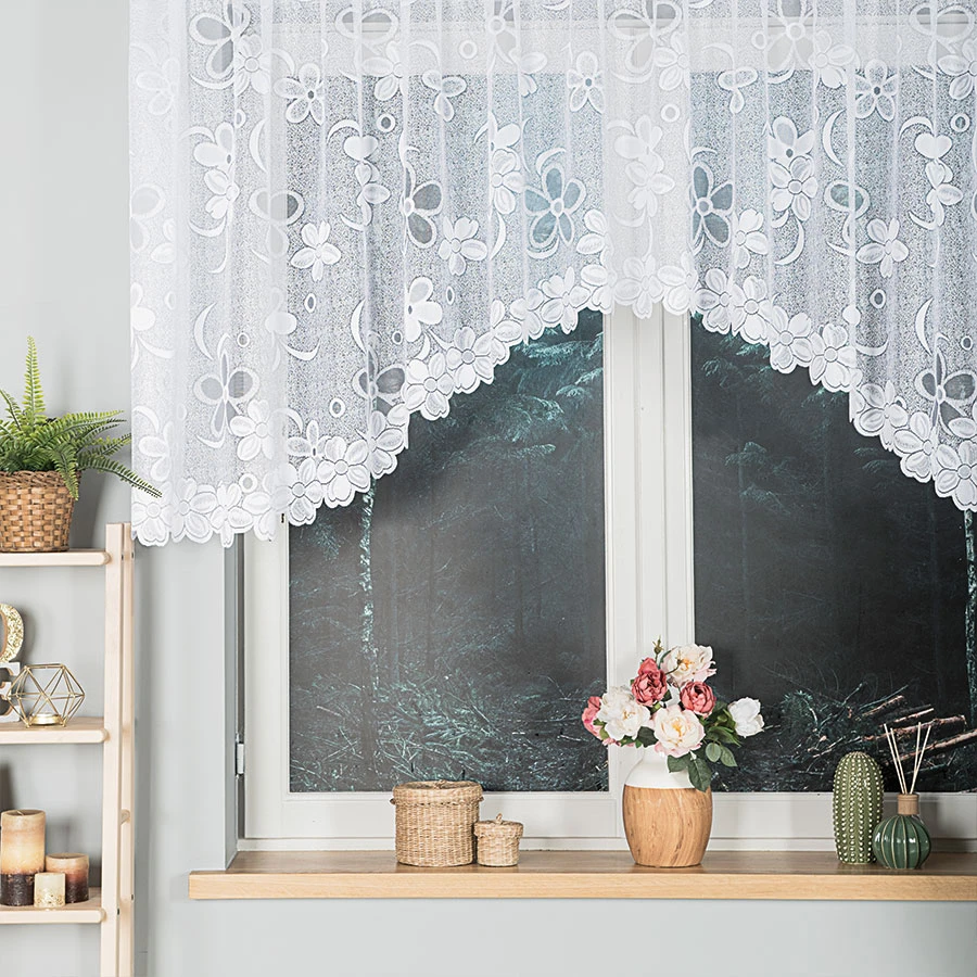 Wykonana z białego żakardu o delikatnie półtransparentnej strukturze, firanka rozjaśnia pomieszczenie, a jednocześnie chroni przed nadmiernym spojrzeniem z zewnątrz. Wzór ułożony w dekoracyjnym pasie prezentuje kwiatowe motywy, które wprowadzają do wnętrza spokój i klasyczny urok 🌿