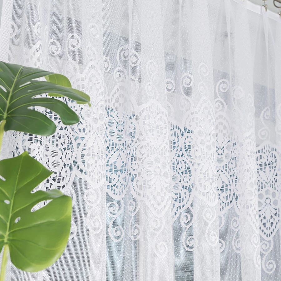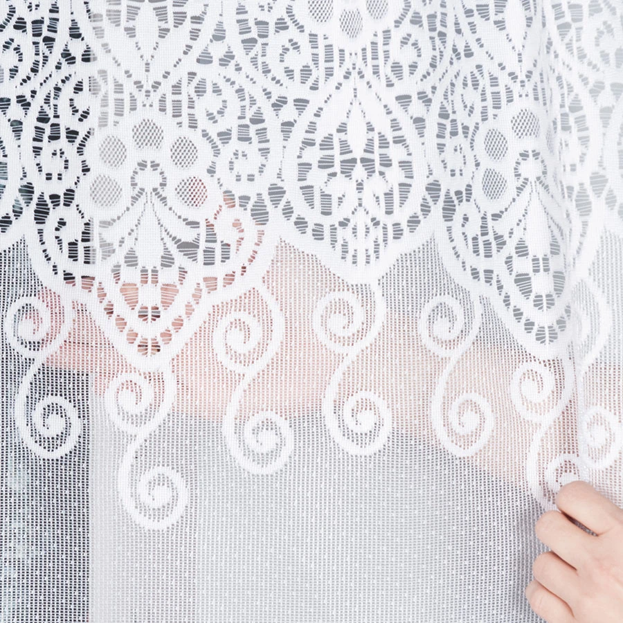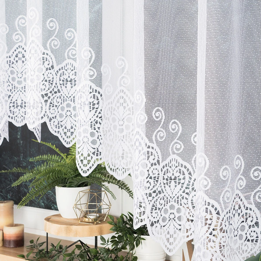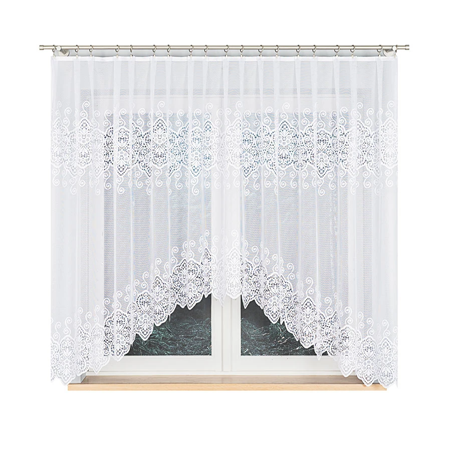 CELINA w rozmiarze 300x160 cm to wyjątkowa firanka, która zachwyca misternym, ażurowym wzorem i dekoracyjnym, finezyjnie wyciętym podcięciem. Jej biały żakard pięknie rozprasza światło, tworząc przytulny, elegancki klimat w pomieszczeniu. To idealny wybór do salonu, jadalni, kuchni czy sypialni, gdzie liczy się estetyka i detal.