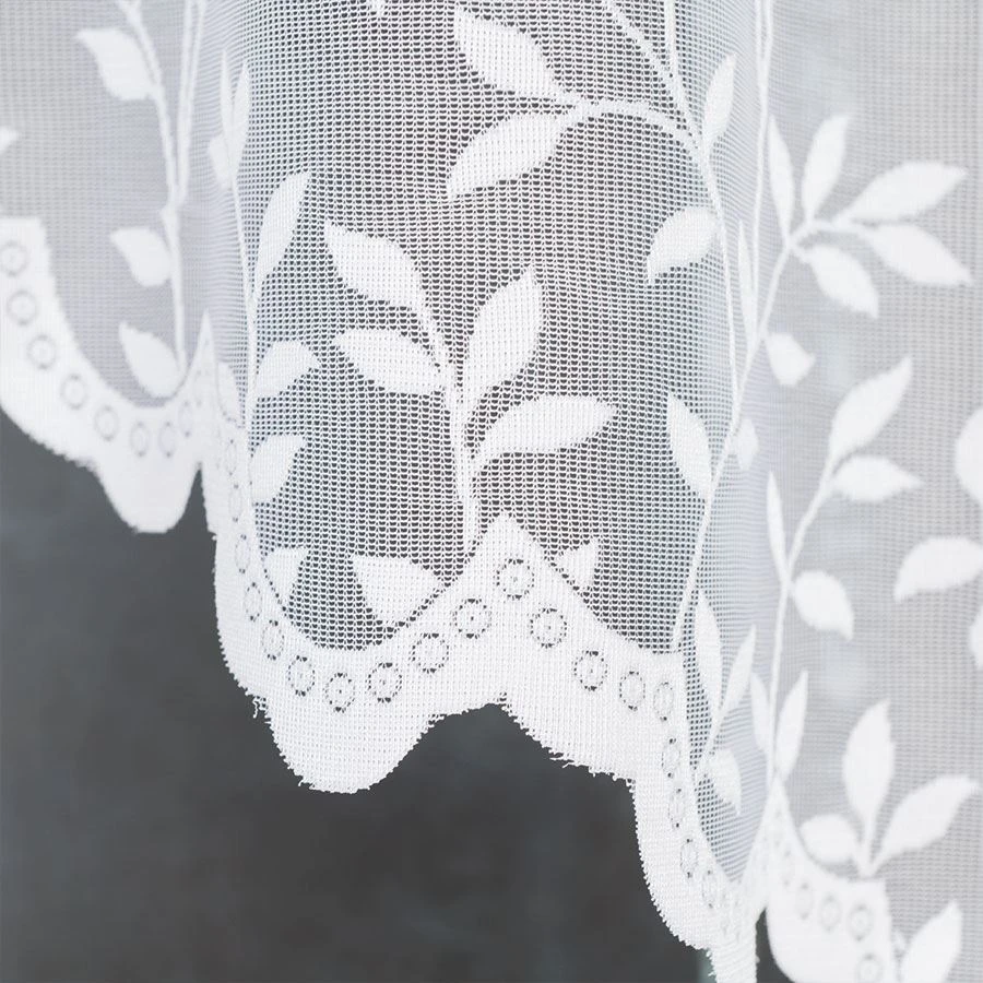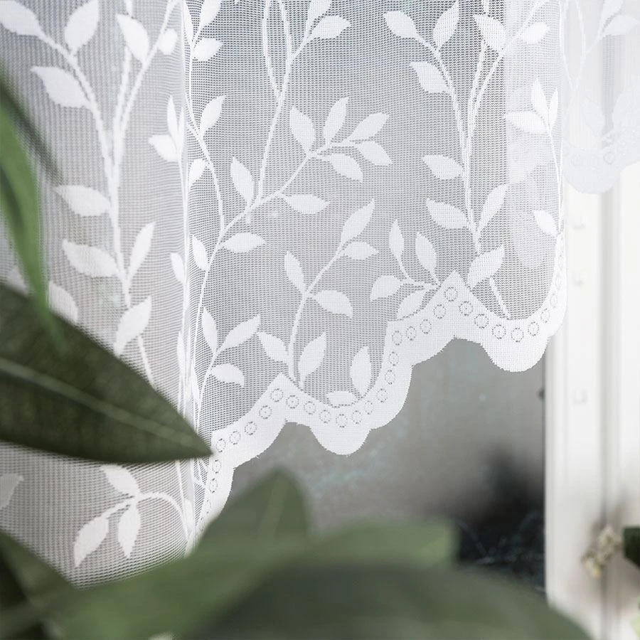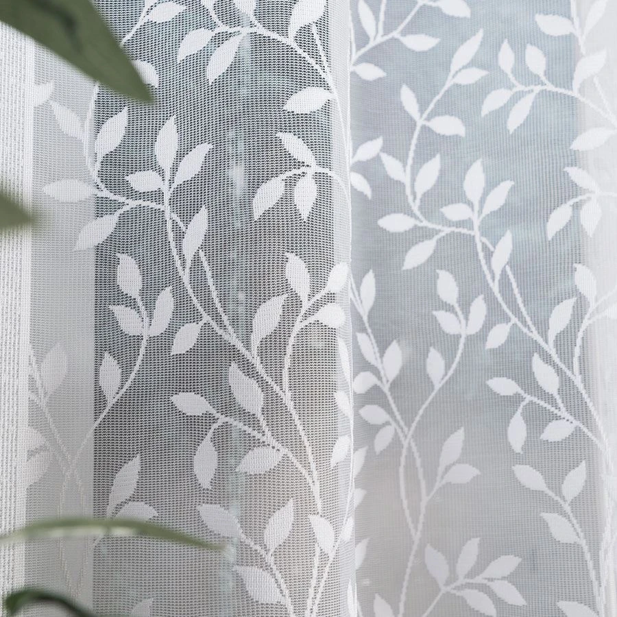 Biały żakardowy materiał o delikatnej strukturze rozprasza światło, a wzór z gałązkami i listkami wnosi do wnętrza spokój i świeżość. Firanka pięknie układa się na karniszu, nie przytłacza przestrzeni i świetnie komponuje się z zielenią roślin doniczkowych 🌿