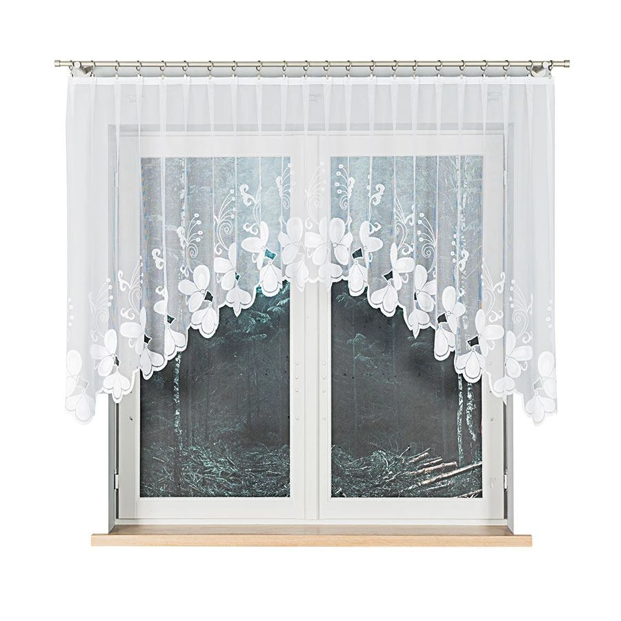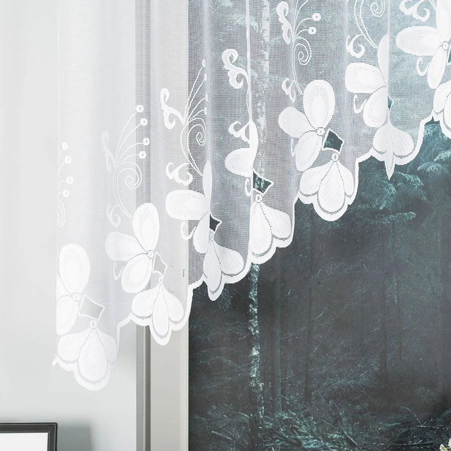 Firanka żakardowa TEODORA o wymiarach 250x120 cm to elegancka i subtelna dekoracja, która doskonale sprawdzi się w mniejszych oknach. Jej biały materiał, wzbogacony delikatnym wzorem, pięknie rozprasza światło, nadając wnętrzu świeżości i lekkości. Charakterystyczne podcięcie na dole, przypominające falujące liście lub płatki kwiatów, dodaje całej kompozycji finezji i sprawia, że firanka wyróżnia się spośród innych modeli.