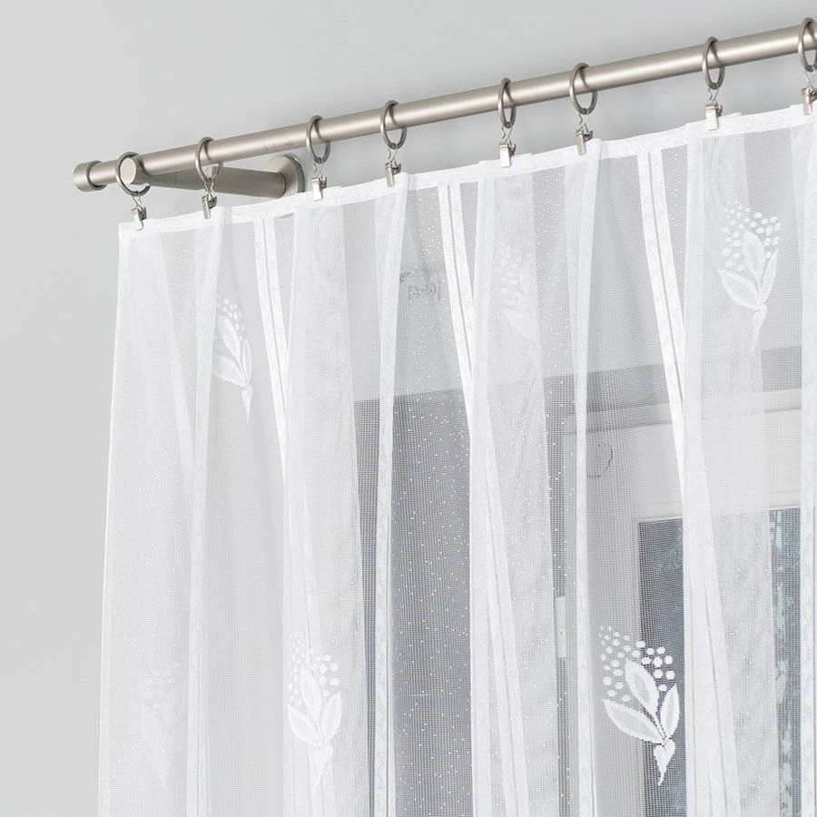 - Zawieszanie na żabki – gładki górny brzeg umożliwia wygodne przypięcie firanki do żabek na karniszu.