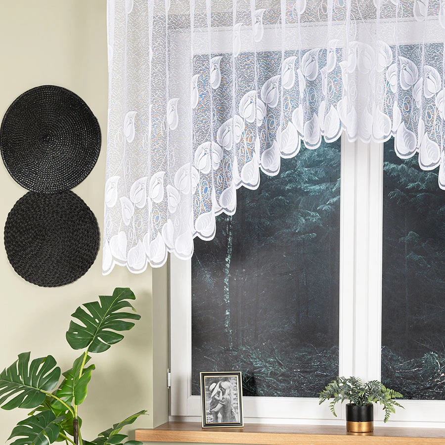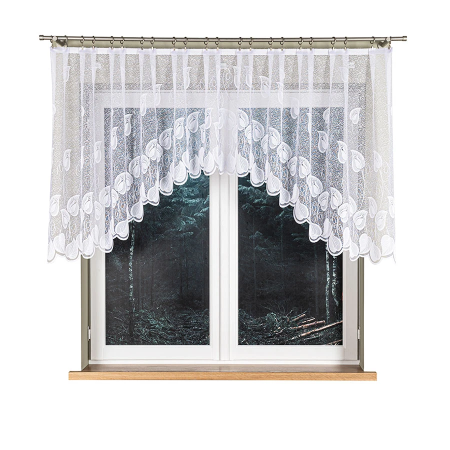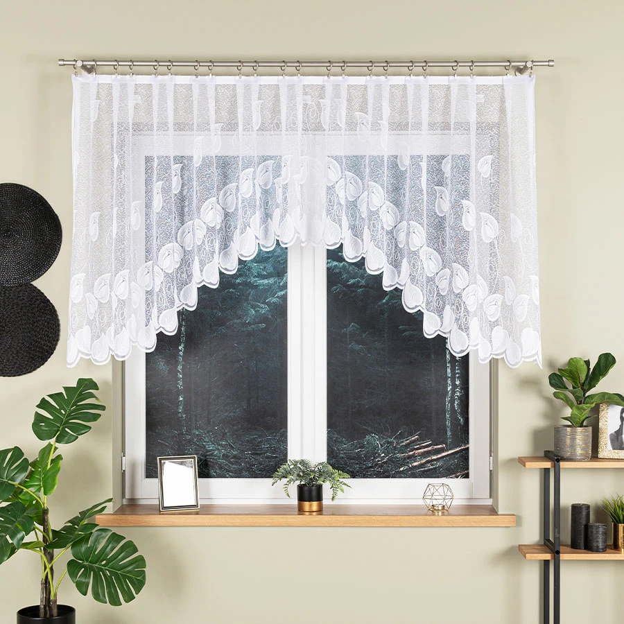 NORA w rozmiarze 300x100 cm to gotowa firanka żakardowa z liściastym wzorem i łagodnym, falistym podcięciem. Jej kompaktowy rozmiar czyni ją idealną do kuchni, jadalni, a także mniejszych okien w salonie czy pokoju dziecięcym. Pasuje na karnisz o szerokości ok. 150 cm po zmarszczeniu.