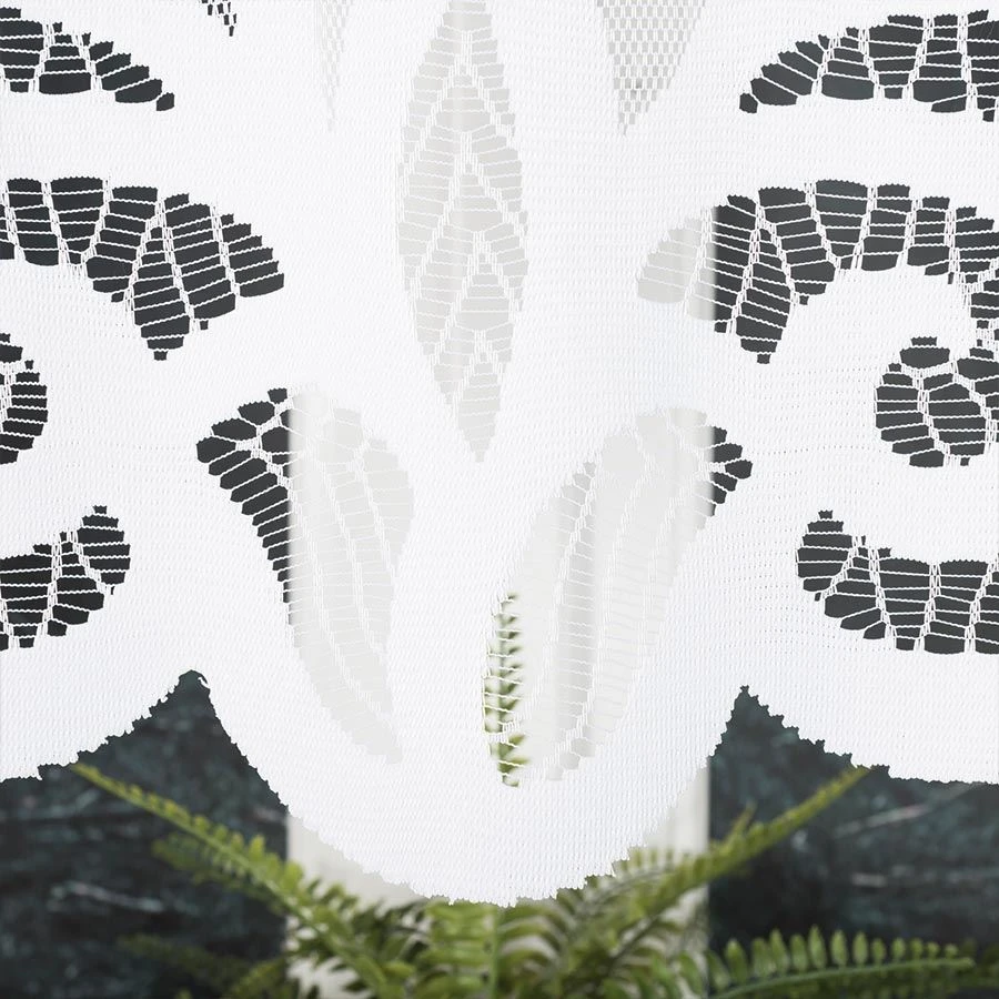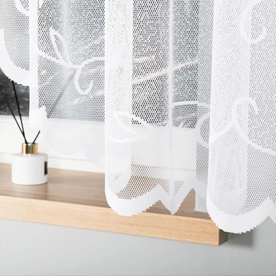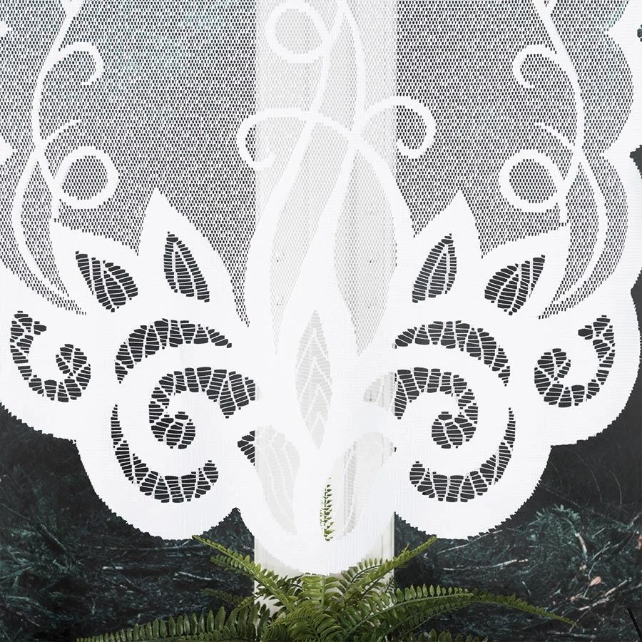 To, co przyciąga wzrok, to ozdobne podcięcie w dolnej części oraz bogaty, ażurowy wzór z motywem liści i roślinnych zawijasów. Ten romantyczny deseń nadaje wnętrzu przytulności i klasy, a jednocześnie zapewnia dostęp światła dziennego dzięki półtransparentnej strukturze żakardu.