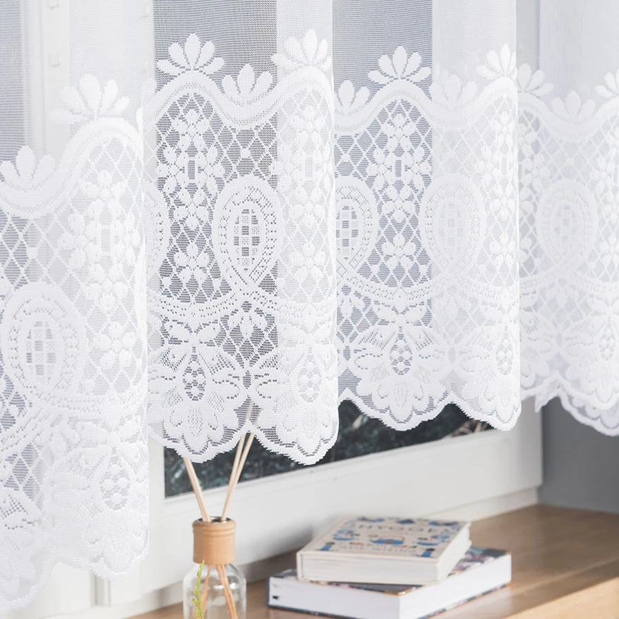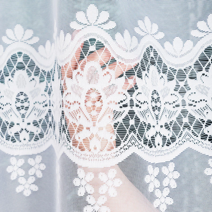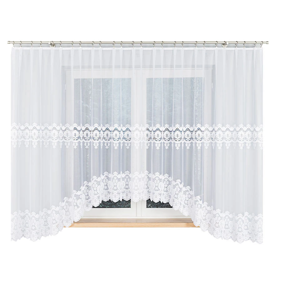 Model DARIA w imponującym rozmiarze 450x175 cm to klasyczna firanka o wysokim walorze dekoracyjnym. Subtelny, biały żakard zdobi efektowny ornamentowy pas umieszczony na wysokości wzroku. Dolna krawędź została wykończona szeroką koronką o falistym podcięciu, które miękko układa się na oknie, dodając całej kompozycji lekkości.