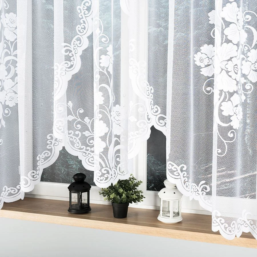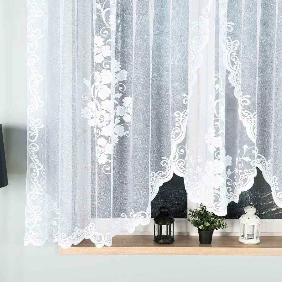 Firanka żakardowa FUKSJA o wymiarach 400x160 cm to propozycja stworzona z myślą o szerokich oknach, które potrzebują eleganckiej, a zarazem subtelnej oprawy. Biały żakardowy materiał zdobiony jest pięknym kwiatowym wzorem i dekoracyjnym podcięciem na dole, które nadaje całości lekkości i finezji. Firanka nie tylko upiększa wnętrze, ale również delikatnie przepuszcza światło, rozświetlając przestrzeń i tworząc przyjemny nastrój.