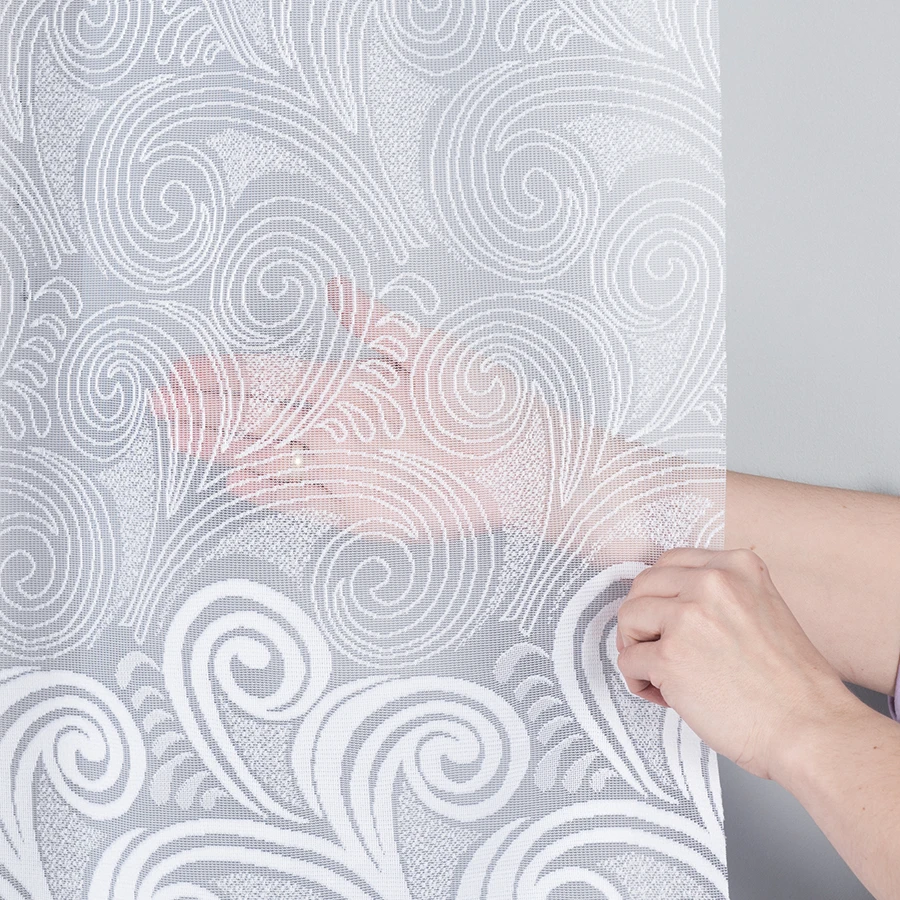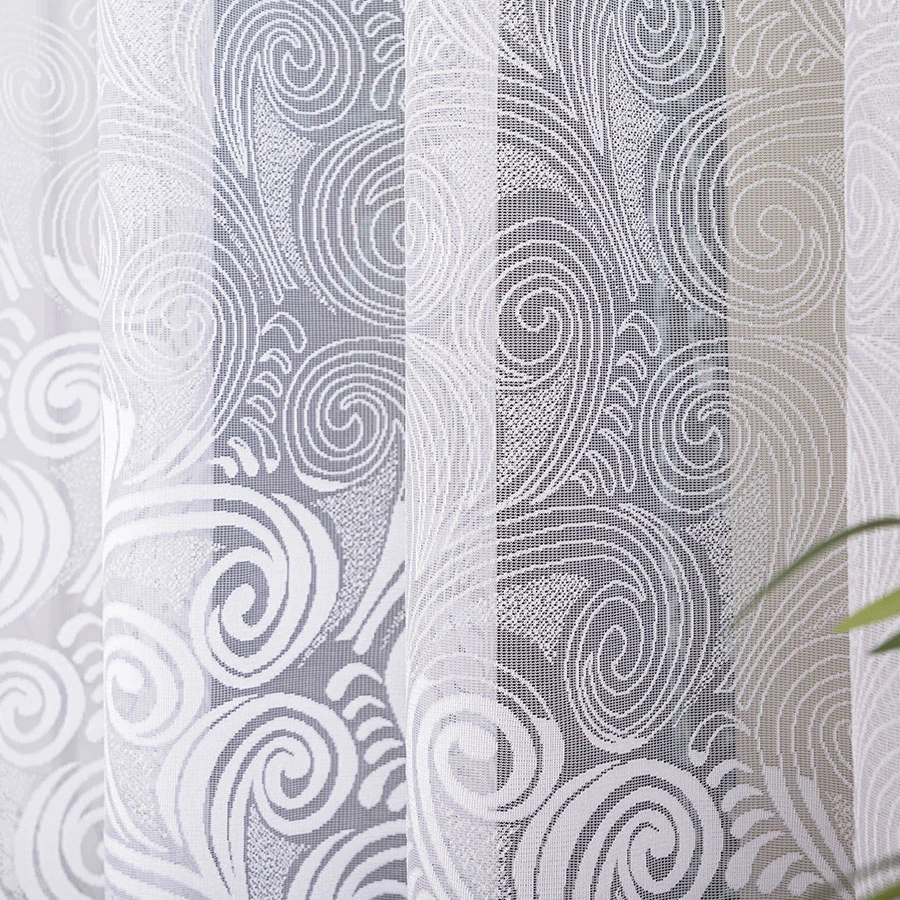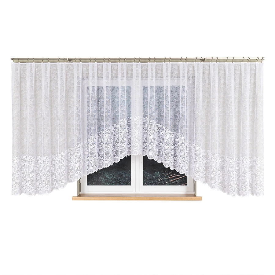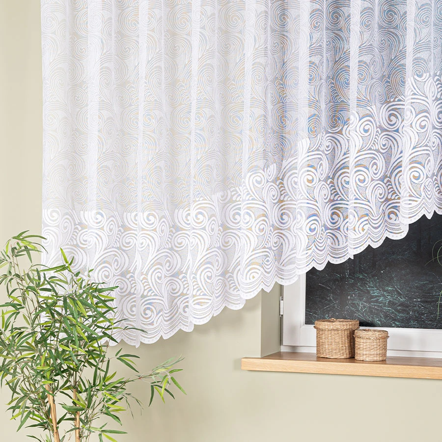 Charakterystyczny wzór w fale i zawijasy sprawia, że firanka wygląda niezwykle dekoracyjnie, ale nie przytłacza przestrzeni. Całość dopełnia łagodnie wycięte podcięcie, które optycznie wysmukla okno i dodaje kompozycji lekkości. To nie tylko dekoracja – to element, który przyciąga wzrok i buduje klimat wnętrza.