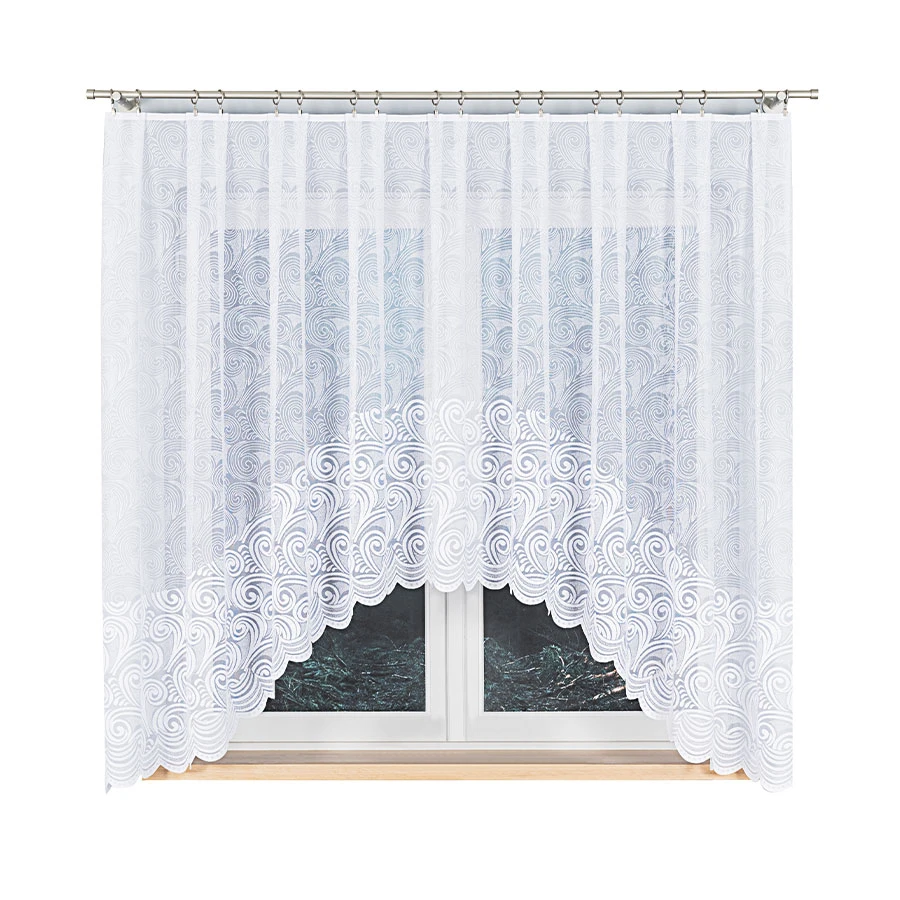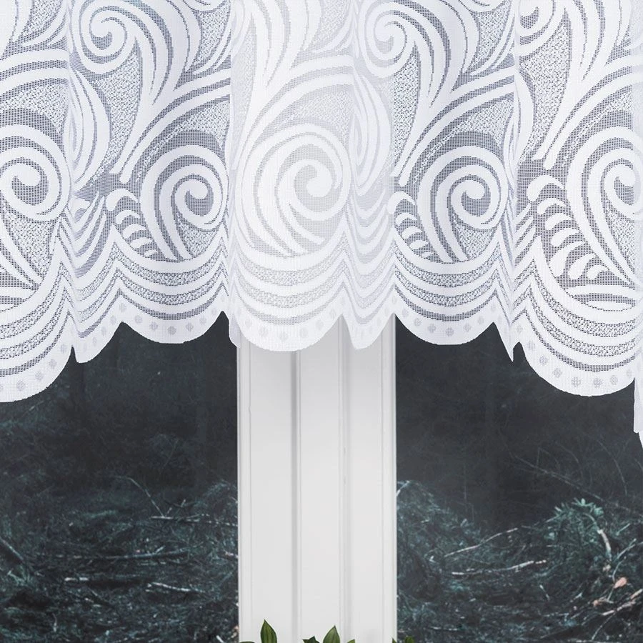 Firanka została uszyta z trwałego, a zarazem lekkiego żakardu w kolorze białym. Materiał efektownie się układa, a łagodne podcięcie na dole dodaje jej wizualnej miękkości. To rozwiązanie nie tylko estetyczne, ale i bardzo praktyczne – zapewnia prywatność, nie ograniczając przy tym dostępu światła dziennego.