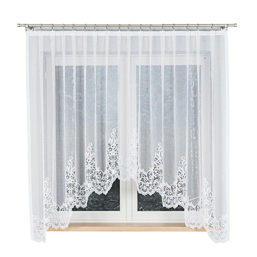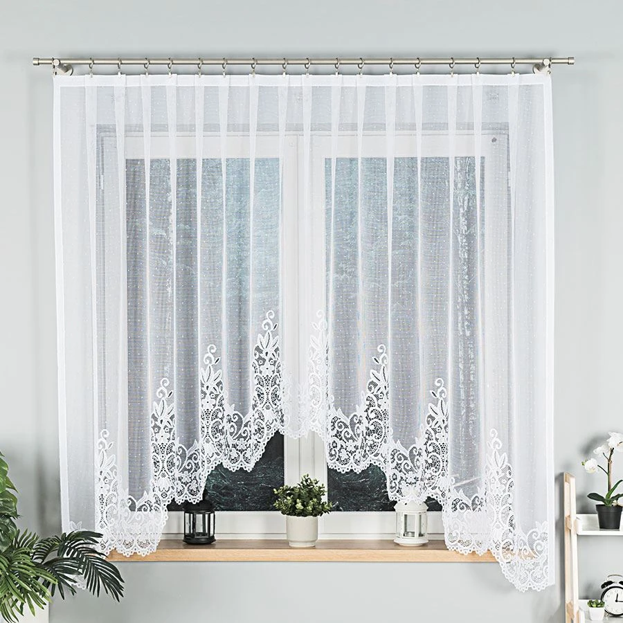 Firanka żakardowa BERENIKA o wymiarach 300x170 cm w klasycznym białym kolorze to idealna dekoracja dla każdego wnętrza, które potrzebuje lekkości i elegancji. Wzór pełen finezyjnych zawijasów i kwiatowych motywów przyciąga spojrzenia, a efektowne podcięcie na dole dodaje firance wyjątkowego uroku. Żakardowy materiał pięknie przepuszcza światło, tworząc w pomieszczeniu ciepłą i przytulną atmosferę, a jednocześnie zapewnia prywatność.