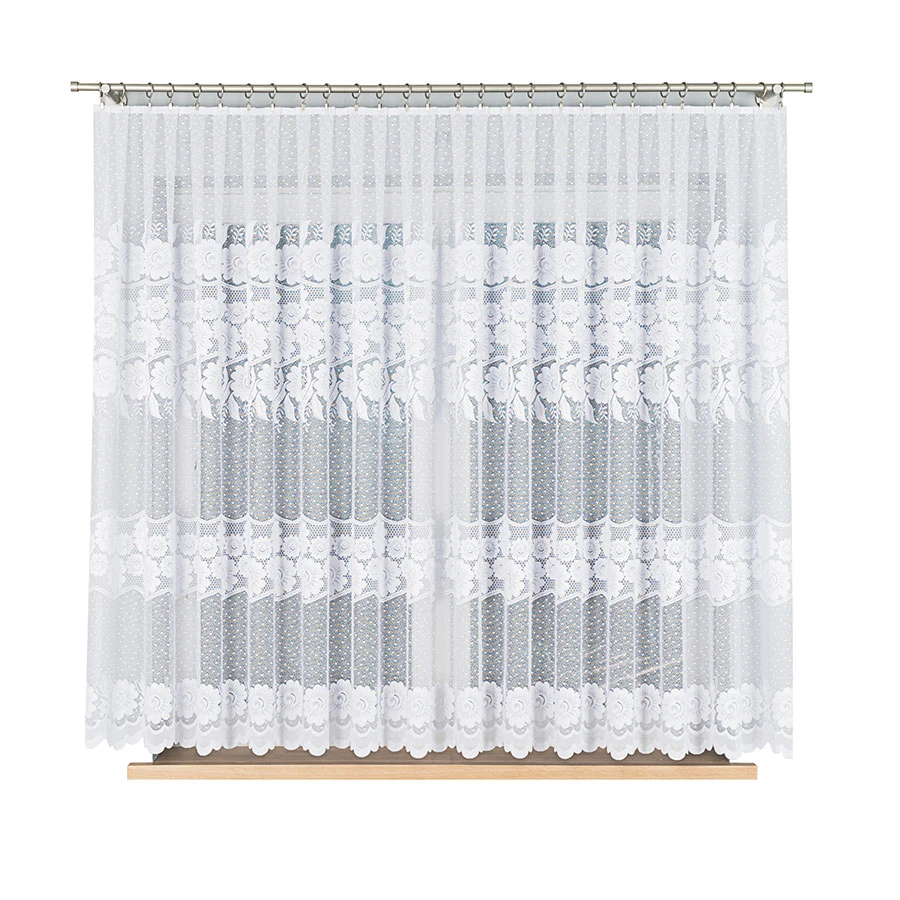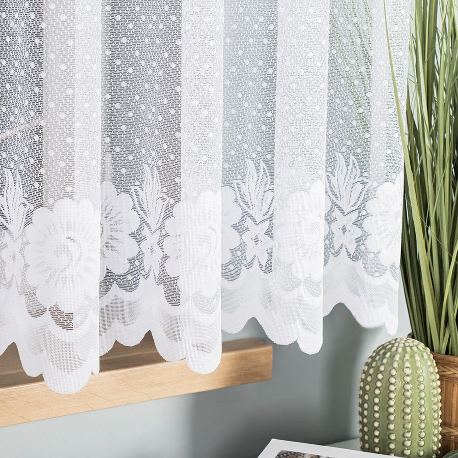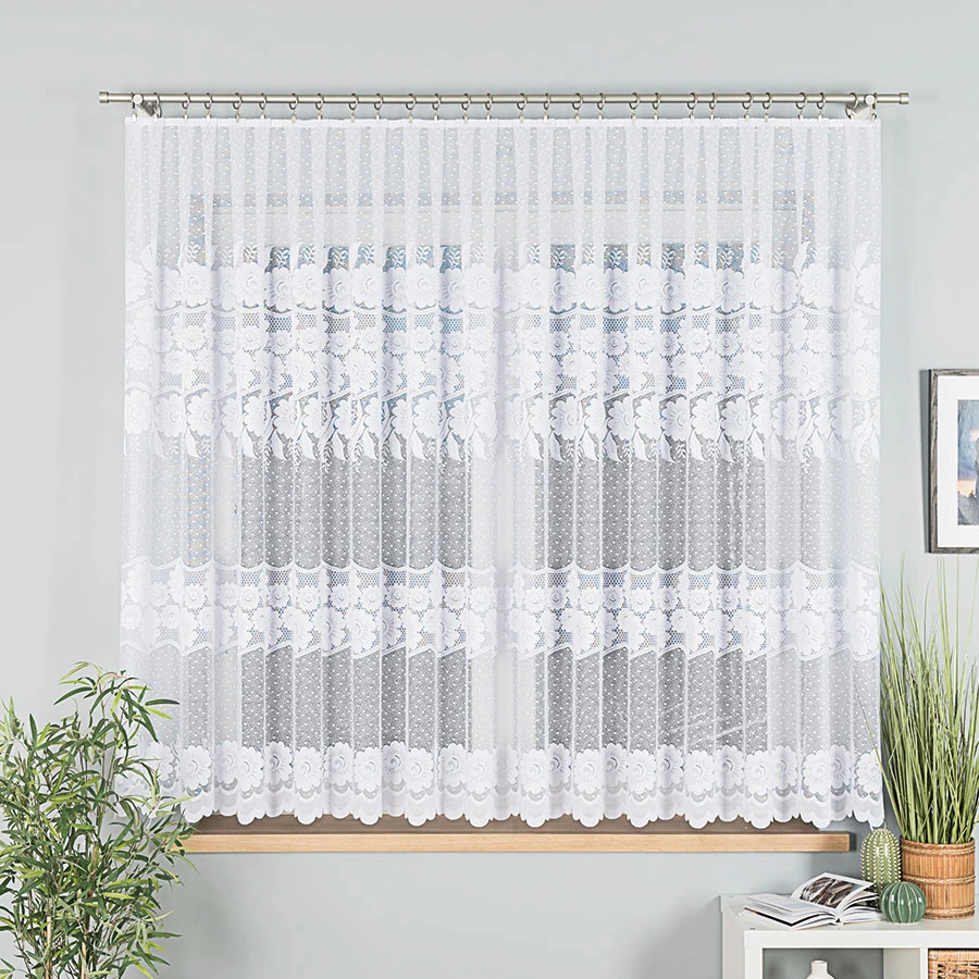 - 🧵 Trwały materiał – żakard jest odporny na zagniecenia i łatwy w pielęgnacji, dzięki czemu firanka długo wygląda jak nowa.