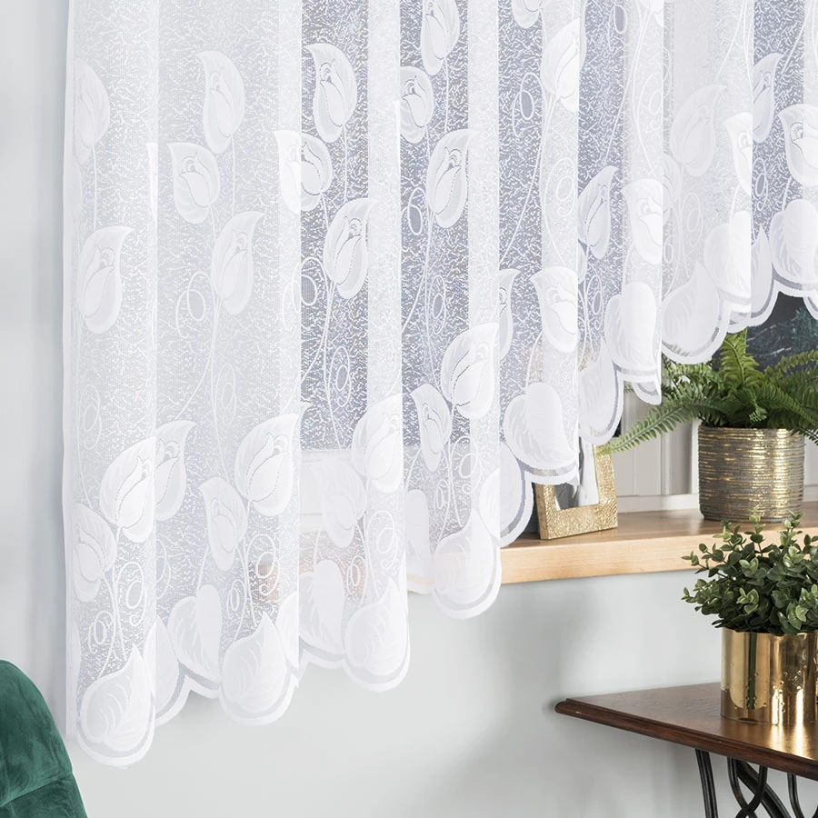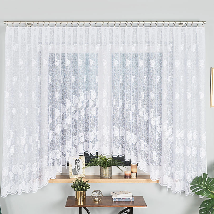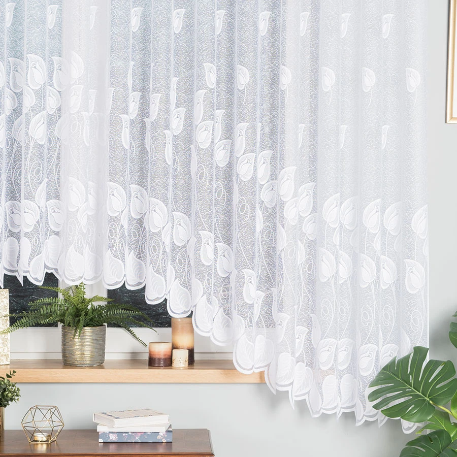 NORA o wymiarze 450x180 cm to gotowa firanka żakardowa z eleganckim, liściastym wzorem i ozdobnym podcięciem w łagodny łuk. Taka szerokość pozwala pięknie zmarszczyć tkaninę na karniszu o długości około 225 cm, dzięki czemu firanka efektownie prezentuje się na dużych oknach i drzwiach balkonowych.