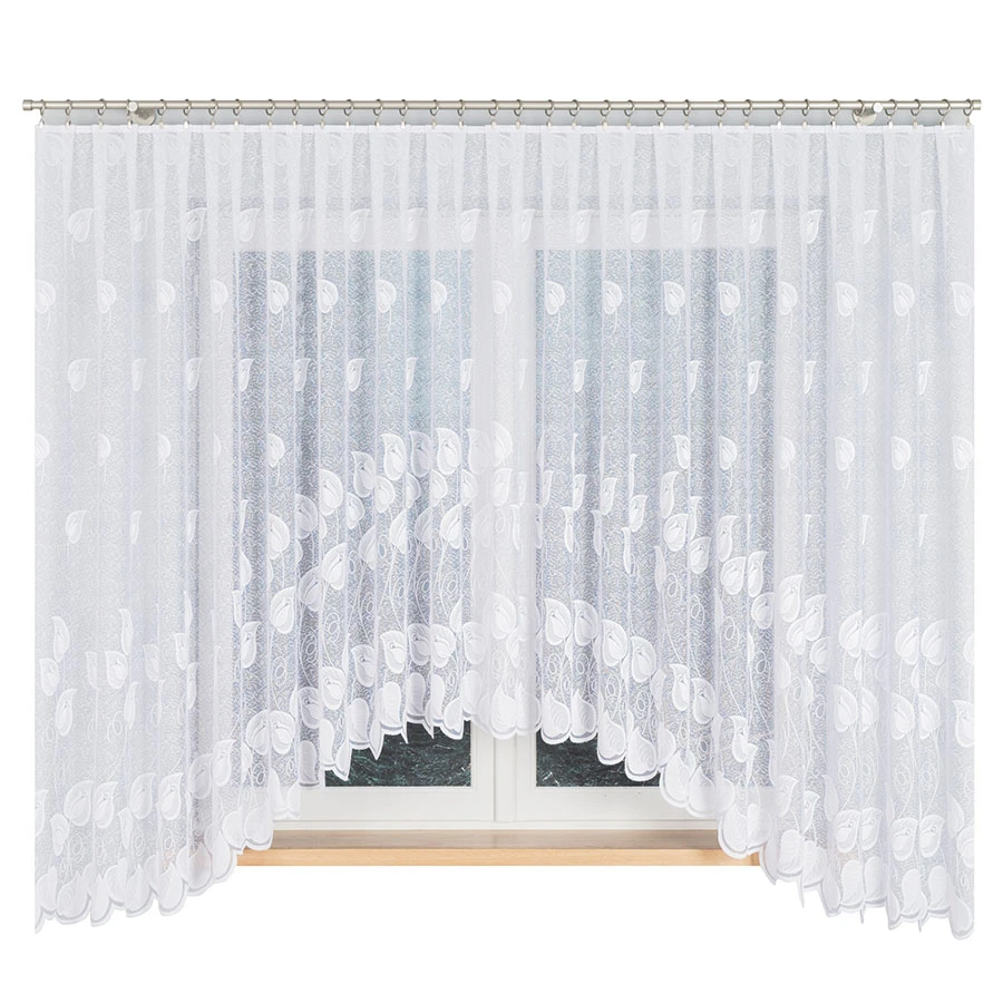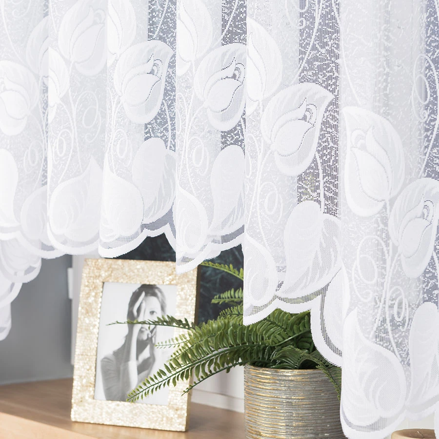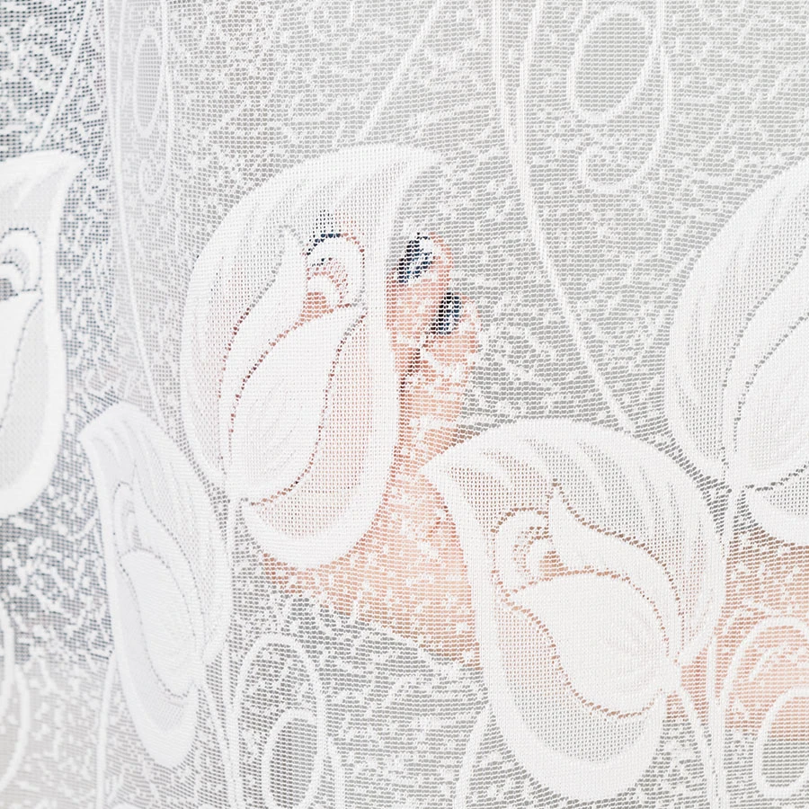 Firanka wykonana jest z półprzezroczystego białego żakardu, który nie tylko dobrze przepuszcza światło, ale także dodaje wnętrzu lekkości. Nie posiada taśmy marszczącej – jest gotowa do zawieszenia na żabki.