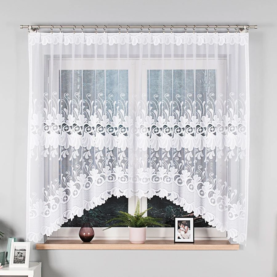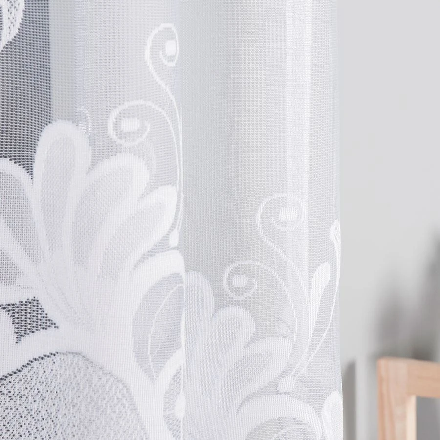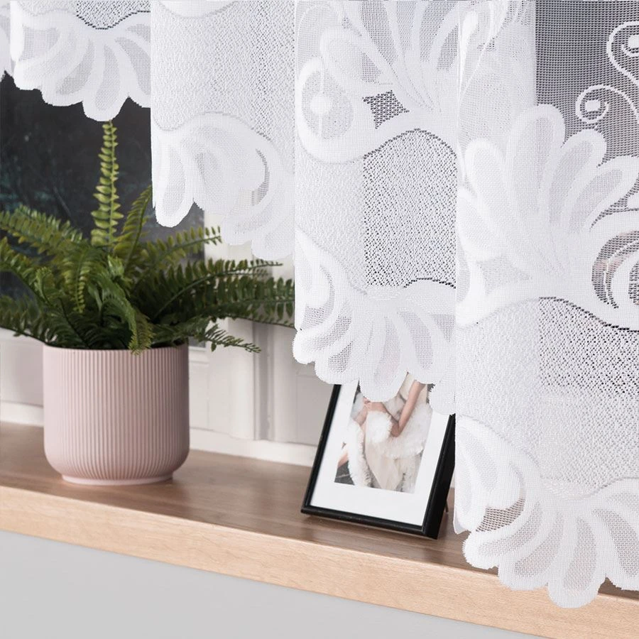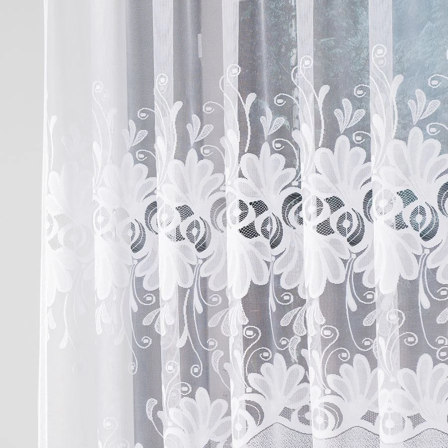 Firanka gotowa KASJANA o wymiarach 320x160 cm to prawdziwa ozdoba okna, która odmieni wygląd każdego pomieszczenia. Wykonana z wysokiej jakości żakardu, zachwyca eleganckim wzorem kwiatowym i delikatnymi ornamentami. Biała barwa wprowadza do wnętrza lekkość i świeżość, optycznie je powiększając. Szczególną uwagę przyciąga subtelne podcięcie na dole, które nadaje firance wyjątkowego charakteru i pięknie eksponuje parapet.