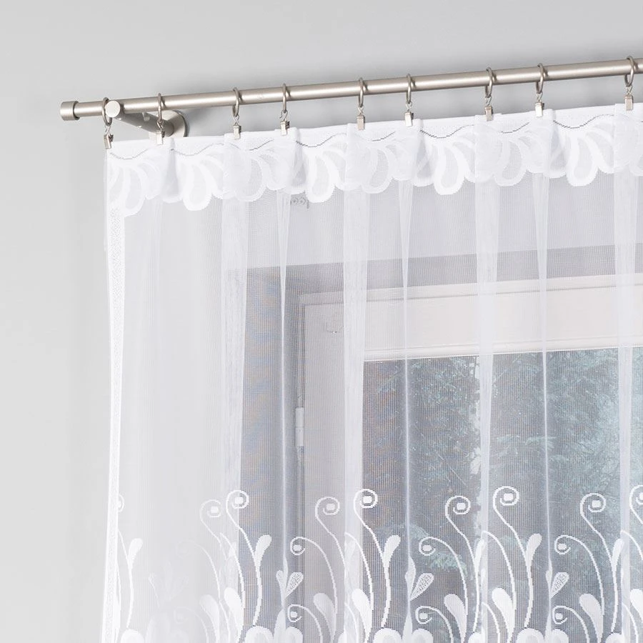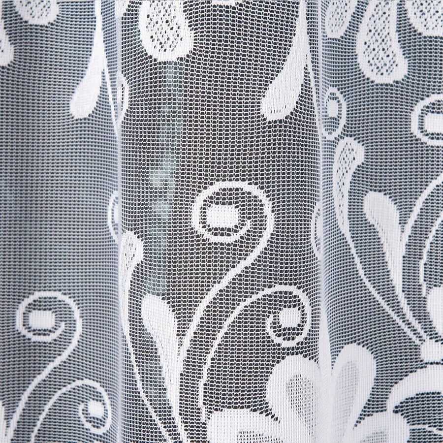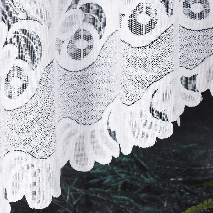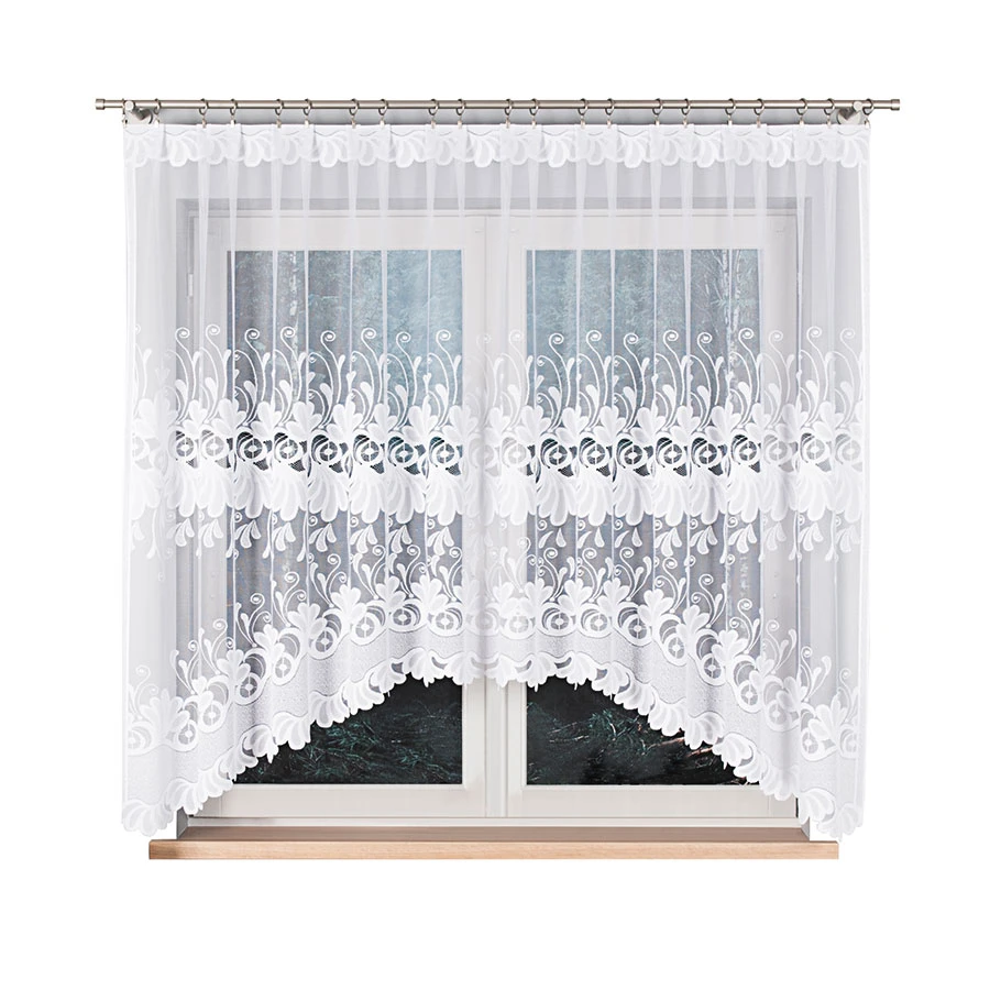 Firanka gotowa KASJANA o wymiarach 320x160 cm to prawdziwa ozdoba okna, która odmieni wygląd każdego pomieszczenia. Wykonana z wysokiej jakości żakardu, zachwyca eleganckim wzorem kwiatowym i delikatnymi ornamentami. Biała barwa wprowadza do wnętrza lekkość i świeżość, optycznie je powiększając. Szczególną uwagę przyciąga subtelne podcięcie na dole, które nadaje firance wyjątkowego charakteru i pięknie eksponuje parapet.