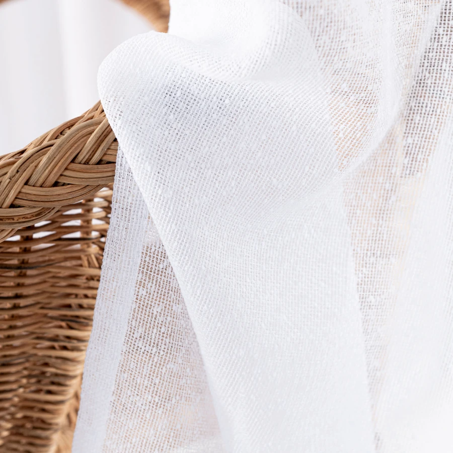 Wykonana z lekkiej, ażurowej tkaniny z subtelnym wzorem, firanka wprowadza do wnętrza przyjemne rozproszenie światła, a jednocześnie nie przytłacza przestrzeni. Charakterystyczny motyw przypominający liście i strukturalne pasy tworzy niepowtarzalny efekt, który doskonale współgra z naturalnymi dodatkami 🌿