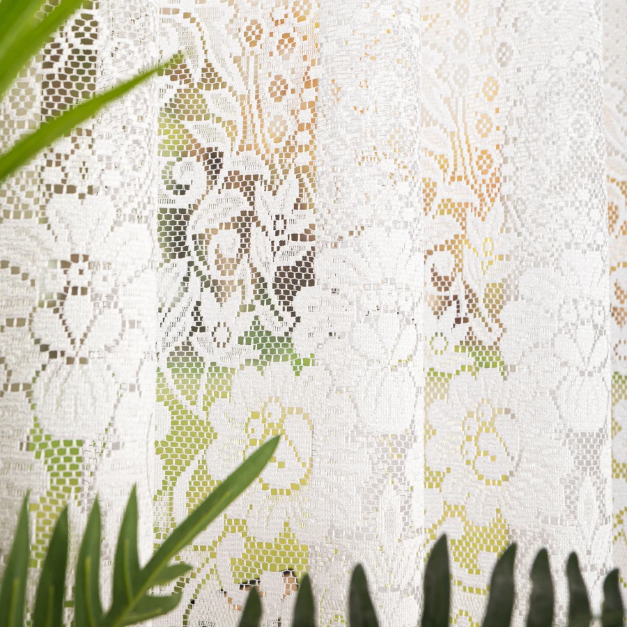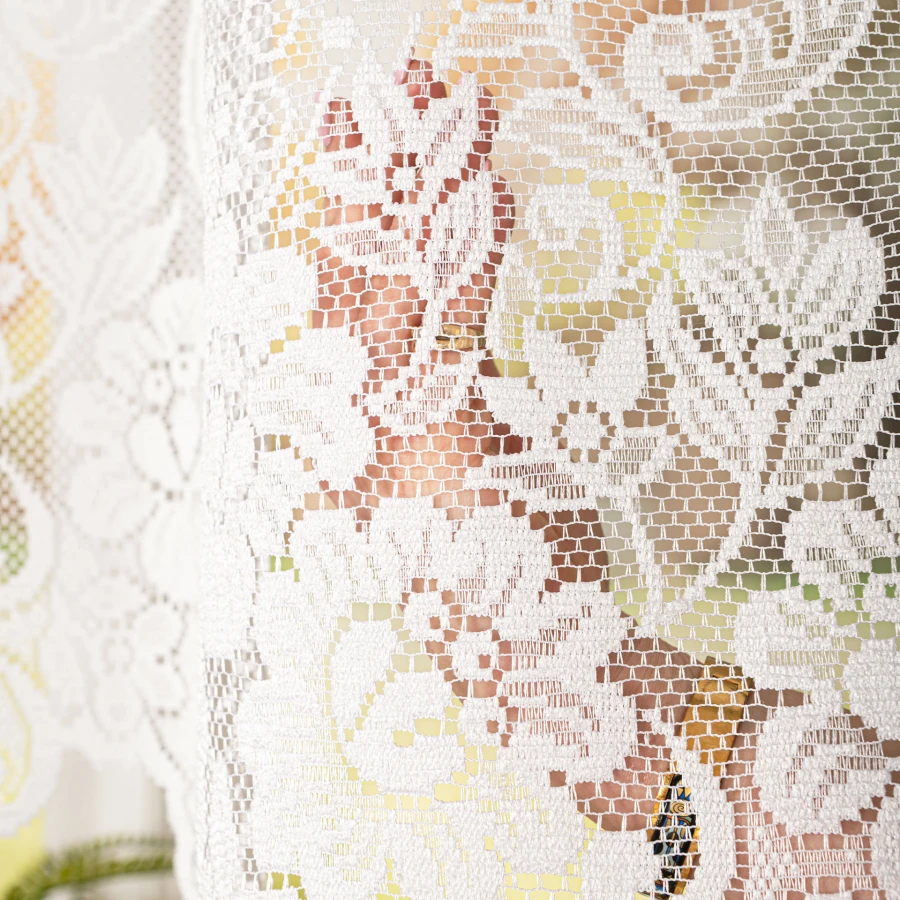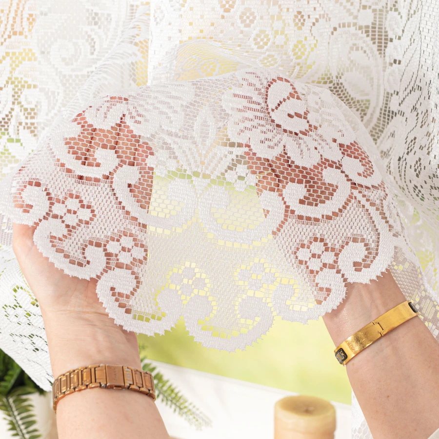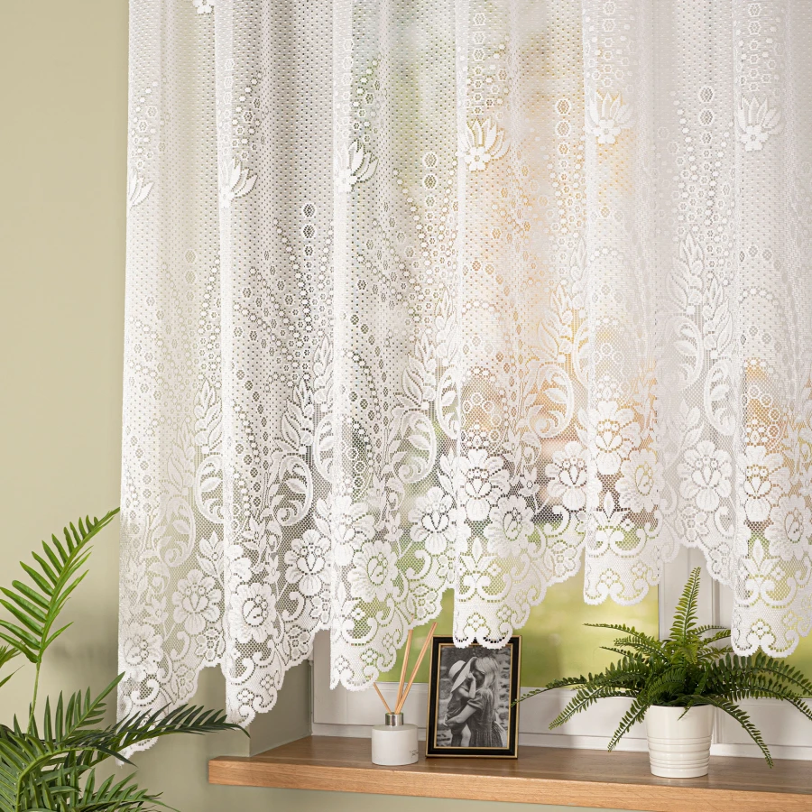 Firanka została wykonana z wysokiej jakości żakardu, który subtelnie przepuszcza światło i optycznie rozświetla wnętrze. Ażurowa struktura i gęsty wzór nadają jej wyjątkowego charakteru, a nieregularna dolna krawędź układa się w efektowną falę, podkreślając dekoracyjność całej kompozycji.