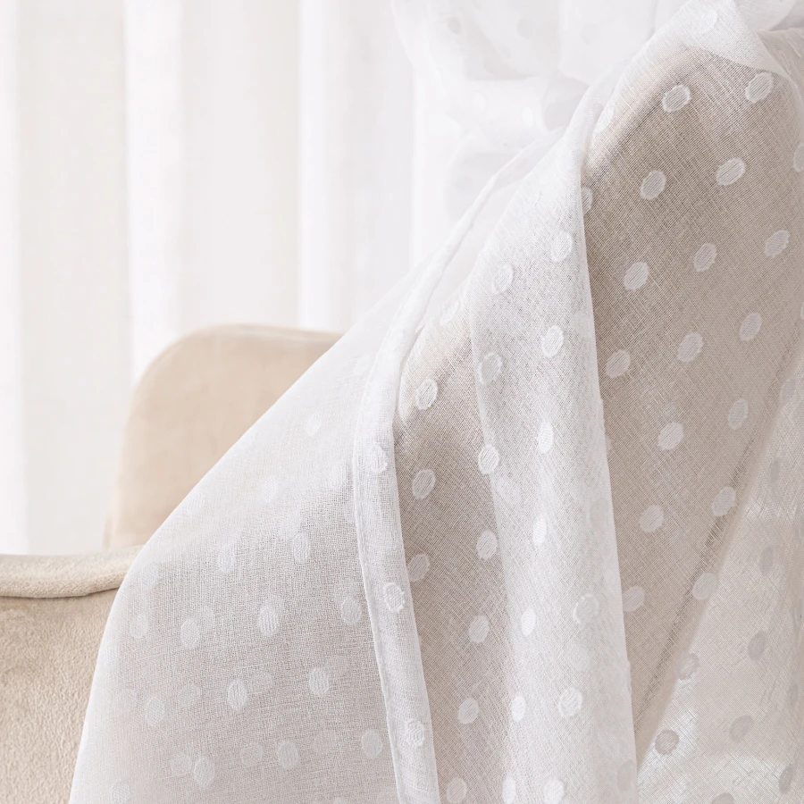 Firanka 424091 to połączenie klasycznej bieli z uroczym wzorem w groszki, który dodaje wnętrzu lekkości i wdzięku. Transparentna tkanina pięknie przepuszcza światło, rozświetlając przestrzeń i tworząc przytulną atmosferę. ✨