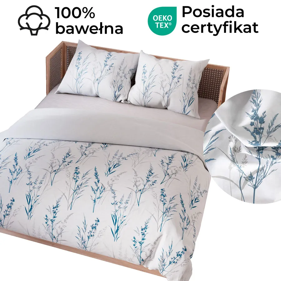SELA to pościel, która zachwyca subtelnym wzornictwem inspirowanym naturą. Na czystym, białym tle rozciągają się lekkie trawy i źdźbła w odcieniach niebieskiego i szarości – jak akwarela namalowana na płótnie. Wzór ten wprowadza do wnętrza atmosferę ciszy, spokoju i lekkości. Idealny wybór dla tych, którzy szukają harmonii w codziennym otoczeniu.