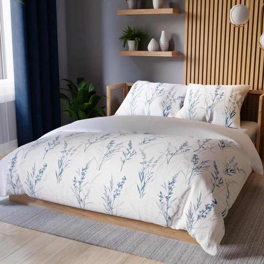 Pościel SELA to idealna propozycja dla tych, którzy cenią minimalizm i bliskość natury. Na śnieżnobiałym tle rozciąga się subtelny, roślinny wzór przypominający polne trawy, namalowane delikatnymi pociągnięciami w odcieniach błękitu i szarości. Wzór ten wprowadza do wnętrza harmonię i świeżość, nadając sypialni lekki, odprężający charakter.