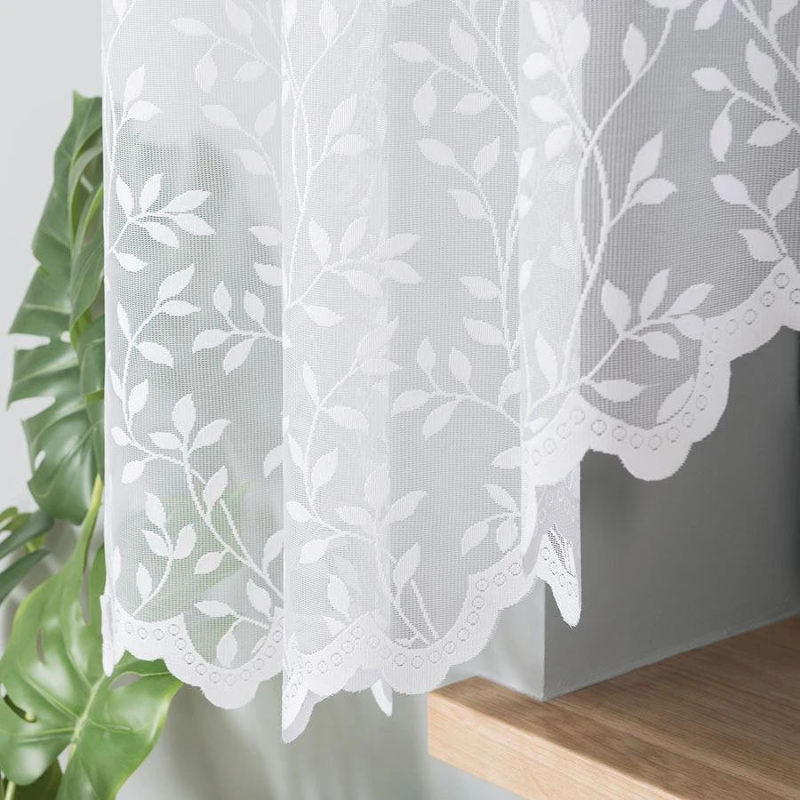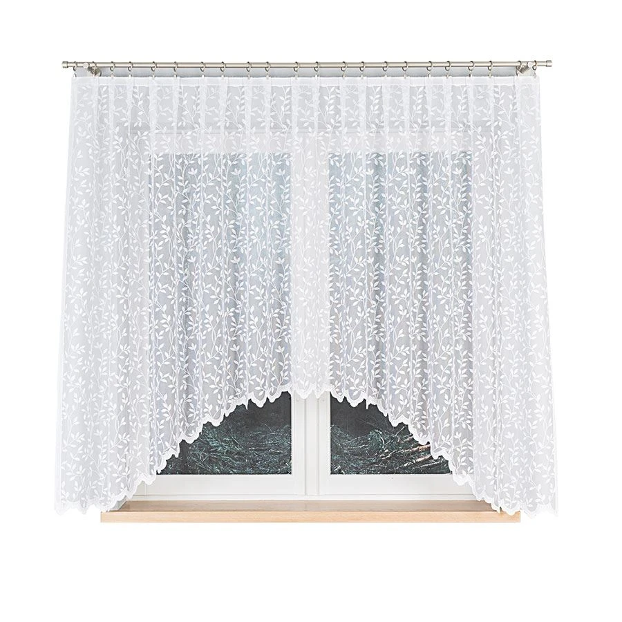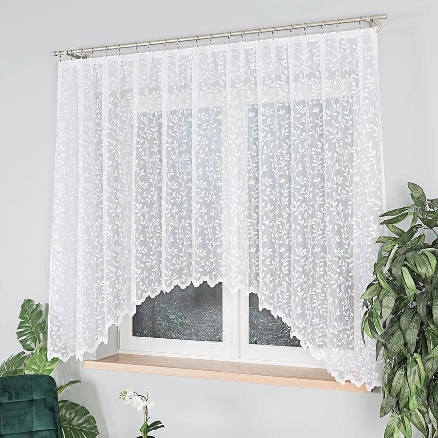Chcesz, by Twój dom zyskał subtelny, świeży klimat? Wybierz firankę żakardową ZUZANNA w rozmiarze 300x160 cm! Gęsty, a zarazem lekki żakard w odcieniu nieskazitelnej bieli zdobi soczysty, roślinny wzór liści, który przepięknie rozprasza światło i ożywia nawet najprostszą aranżację. Urokliwe podcięcie na dole dodaje całości delikatności i sprawia, że firanka prezentuje się wyjątkowo elegancko. Ta dekoracja to gotowy sposób na okno, które zachwyca i zapewnia domownikom oraz gościom poczucie prywatności. 🌿🤍