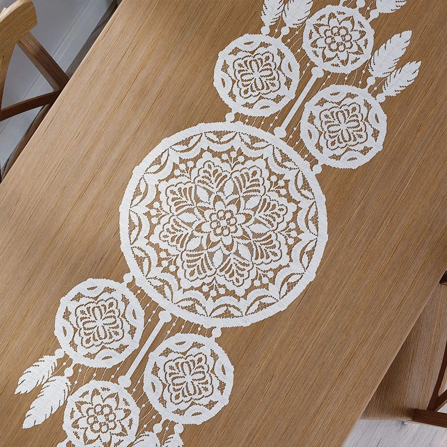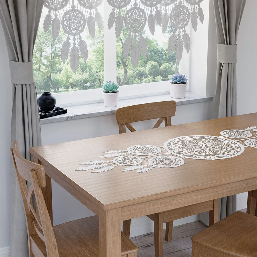 Żakardowy bieżnik na stół, łapacz snów LEA. Rozmiar: 45x155cm Kolor: biały Skład: 100% poliester TOWAR DOSTĘPNY DO WYCZERPANIA STANÓW MAGAZYNOWYCH.