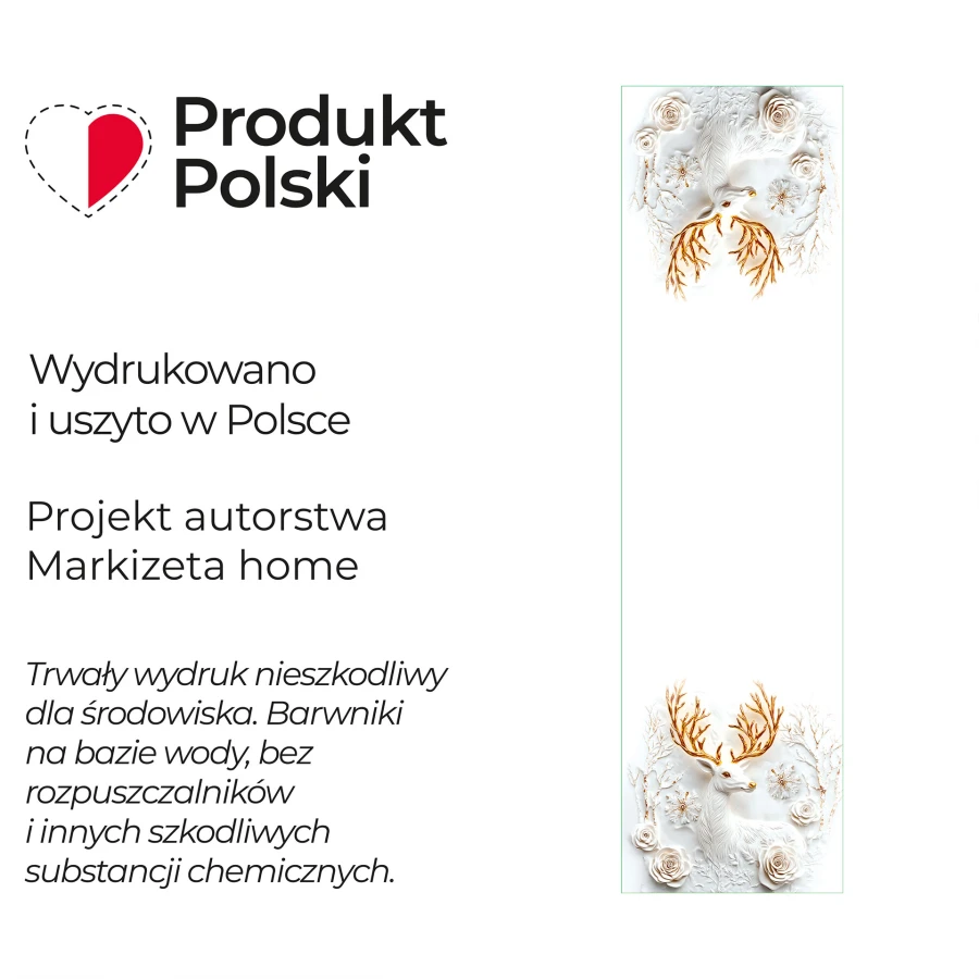 Bieżnik wodoodporny na podkładzie NINA WODOODPORNA.Doskonale pasuje do innych dekoracji z tej samej serii.Wykończono chmurką ultrasoniczną.Rozmiar: 38x140cmWYPRODUKOWANO W POLSCE