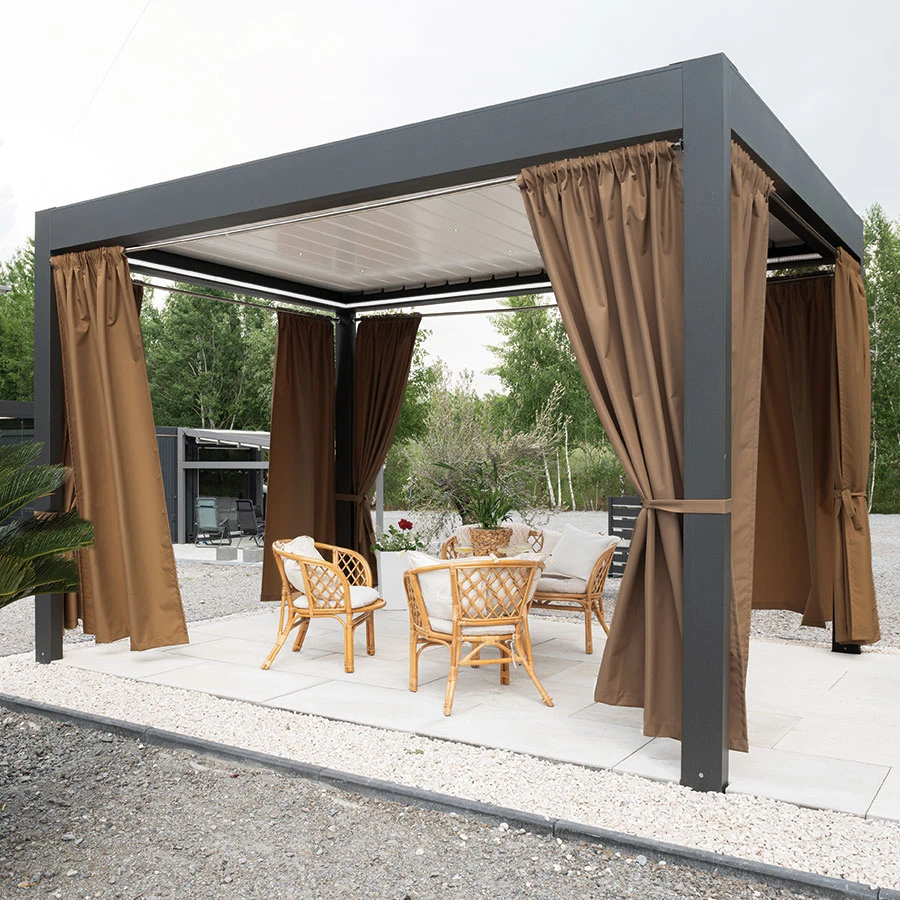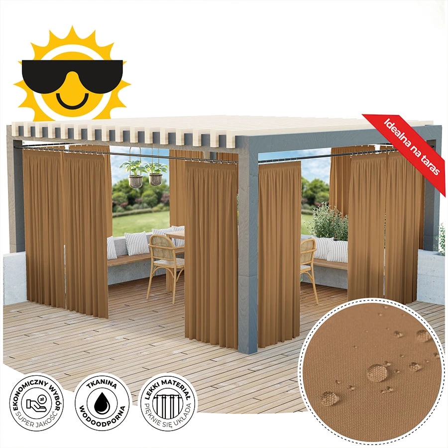 Tkanina dekoracyjna Gramatura: 140g/m2Skład:100% Poliester Zasłona ogrodowa Gardenia wodoodporne wykończenie chroni przed deszczem oraz wilgoci, dzięki czemu będzie bardziej odporna na czynniki zewnętrzne.Przeznaczona jest do użytkowania na tarasie, pergoli, balkonie czy altanie. Zasłona wykończona taśmą wielofunkcyjną z możliwością zawieszenia na żabki, agrafki oraz tunel. Kolekcja zasłon Gardenia składa się z siedmiu kolorów dostępnych w różnych rozmiarach.