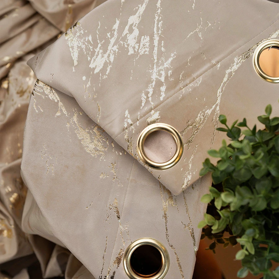 Pozwól sobie na luksusowy akcent we wnętrzu! Zasłona MARMA w odcieniu ciemnego beżu z efektownym złotym nadrukiem to propozycja dla fanów nowoczesnych, a zarazem eleganckich dekoracji. Jej ekskluzywny welwetowy materiał pięknie odbija światło, tworząc niepowtarzalny klimat w salonie, sypialni czy biurze. Przelotki gwarantują łatwy i szybki montaż, a unikatowy marmurkowy wzór ze złotym połyskiem doskonale podkreśla charakter aranżacji. ✨