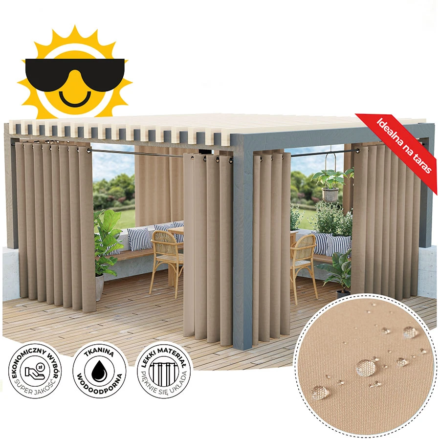 Zasłona ogrodowa Gardenia wodoodporne wykończenie chroni przed deszczem oraz wilgoci, dzięki czemu będzie bardziej odporna na czynniki zewnętrzne.Przeznaczona jest do użytkowania na tarasie, pergoli, balkonie czy altanie. Zasłona posiada 8 metalowych przelotek wykonanych ze stali nierdzewnej.Kolekcja zasłon Gardenia składa się z siedmiu kolorów dostępnych w różnych rozmiarach.