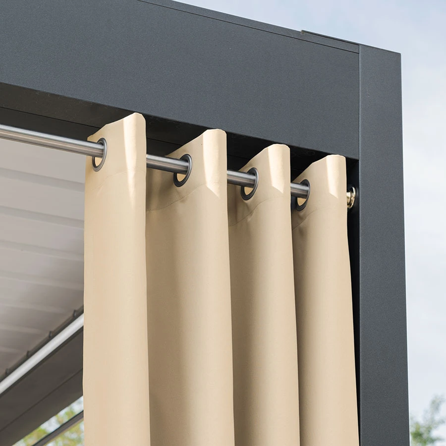 Zasłona ogrodowa Gardenia wodoodporne wykończenie chroni przed deszczem oraz wilgoci, dzięki czemu będzie bardziej odporna na czynniki zewnętrzne.Przeznaczona jest do użytkowania na tarasie, pergoli, balkonie czy altanie. Zasłona posiada 8 metalowych przelotek wykonanych ze stali nierdzewnej.Kolekcja zasłon Gardenia składa się z siedmiu kolorów dostępnych w różnych rozmiarach.