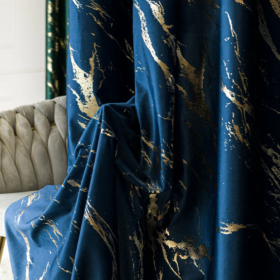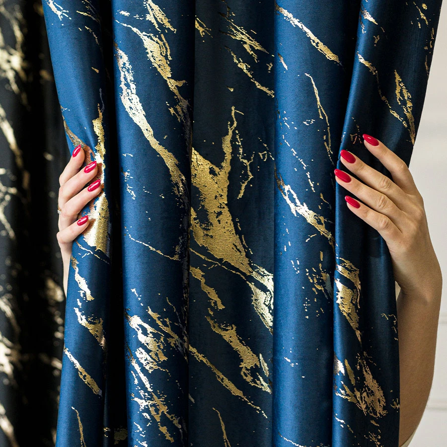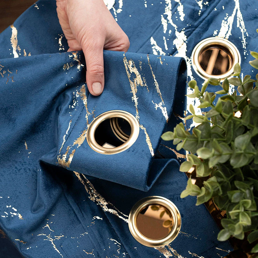 Zasłona MARMA w głębokim odcieniu granatu ze spektakularnym, przecieranym złotym nadrukiem przyciąga wzrok i zamienia każde wnętrze w elegancką przestrzeń z nutą luksusu. Masywny, miękki welwet efektownie mieni się w świetle dziennym i sztucznym – wprowadzając aurę przytulności i wyjątkowości. Idealna dla wszystkich, którzy uwielbiają niebanalne, wyraziste dodatki i chcą szybko odmienić wystrój okna – bez wysiłku! ✨