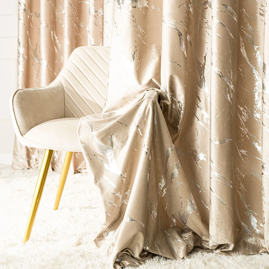 Zasłona gotowa na przelotkach o wymiarach 140 x 250 cm. Wykonana z welwetowego materiału z dekoracyjnym jednostronnym srebrnym marmurowym nadrukiem to połączenie elegancji i nowoczesności.Zasłony MARMA dostępne są w dwunastu kolorach. Skład: 100% Poliester Gramatura: 210g/m2Towar pakowany po 22 szt. w kartonie.