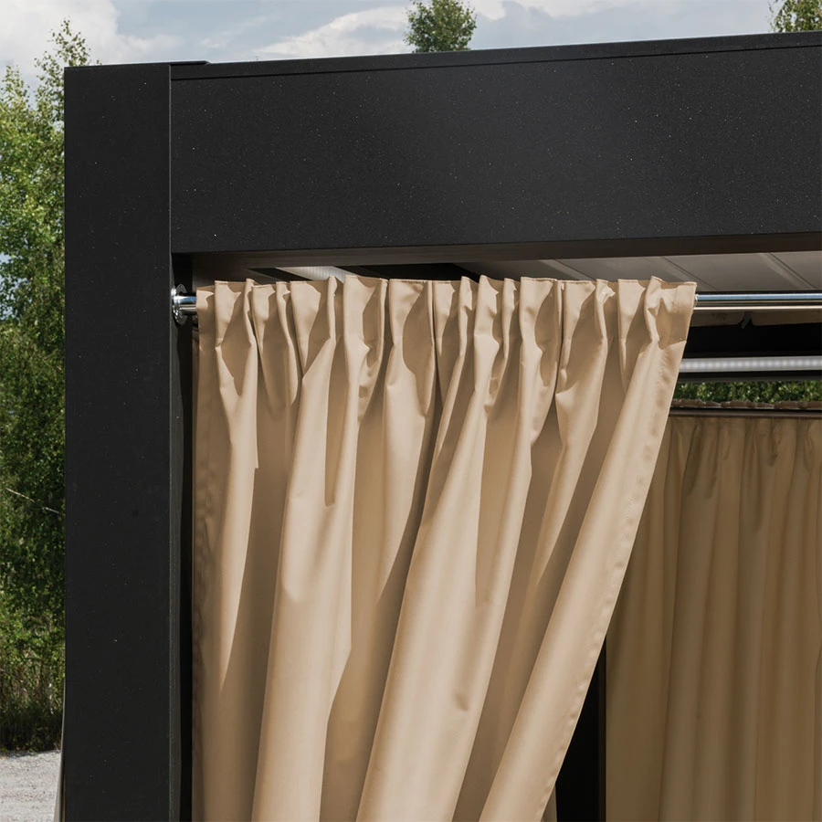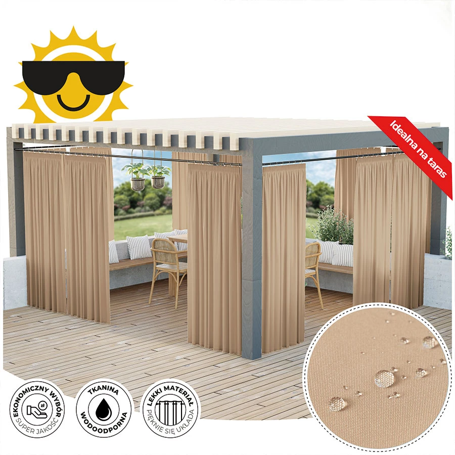 Zasłona ogrodowa Gardenia wodoodporne wykończenie chroni przed deszczem oraz wilgoci, dzięki czemu będzie bardziej odporna na czynniki zewnętrzne.Przeznaczona jest do użytkowania na tarasie, pergoli, balkonie czy altanie. Zasłona wykończona taśmą wielofunkcyjną z możliwością zawieszenia na żabki, agrafki oraz tunel. Kolekcja zasłon Gardenia składa się z siedmiu kolorów dostępnych w różnych rozmiarach.
