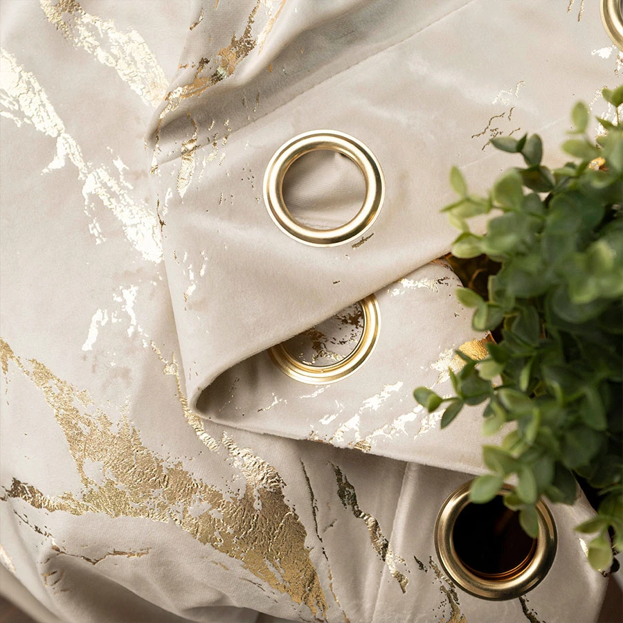 Stwórz wyjątkowy klimat w swoim wnętrzu z zasłoną MARMA w rozmiarze 140x250 cm! Miękki, luksusowy welwet w jasnym kremowym kolorze ozdobiony przecieranym, złotym nadrukiem sprawia, że każde pomieszczenie nabiera blasku i stylowej elegancji. Ten subtelny marmurowy wzór znakomicie odbija światło i efektownie podkreśla charakter zarówno nowoczesnych, jak i klasycznych aranżacji.✨ Zasłona MARMA to gotowa dekoracja okienna na metalowych przelotkach, dzięki którym montaż trwa dosłownie chwilę. Dodaj wnętrzu nutę luksusu i ciesz się praktyczną ozdobą na co dzień! 🤗