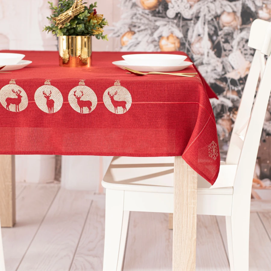 Elegancki i praktyczny obrus wykonany z wysokiej jakości tkaniny poliestrowej.Obrus haftowany z błyszczącą nicią.Wykończony na brzegach wąską listwą. Rozmiar: 120x160 cm Gramatura: 200gsm Skład: 100% Poliester