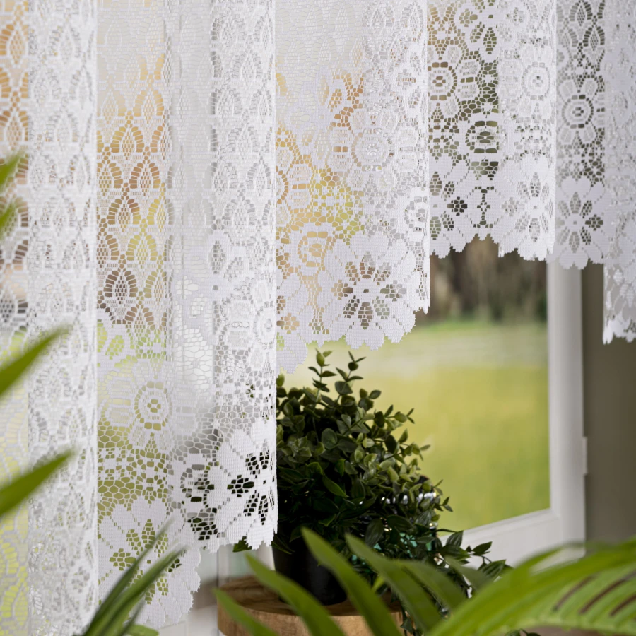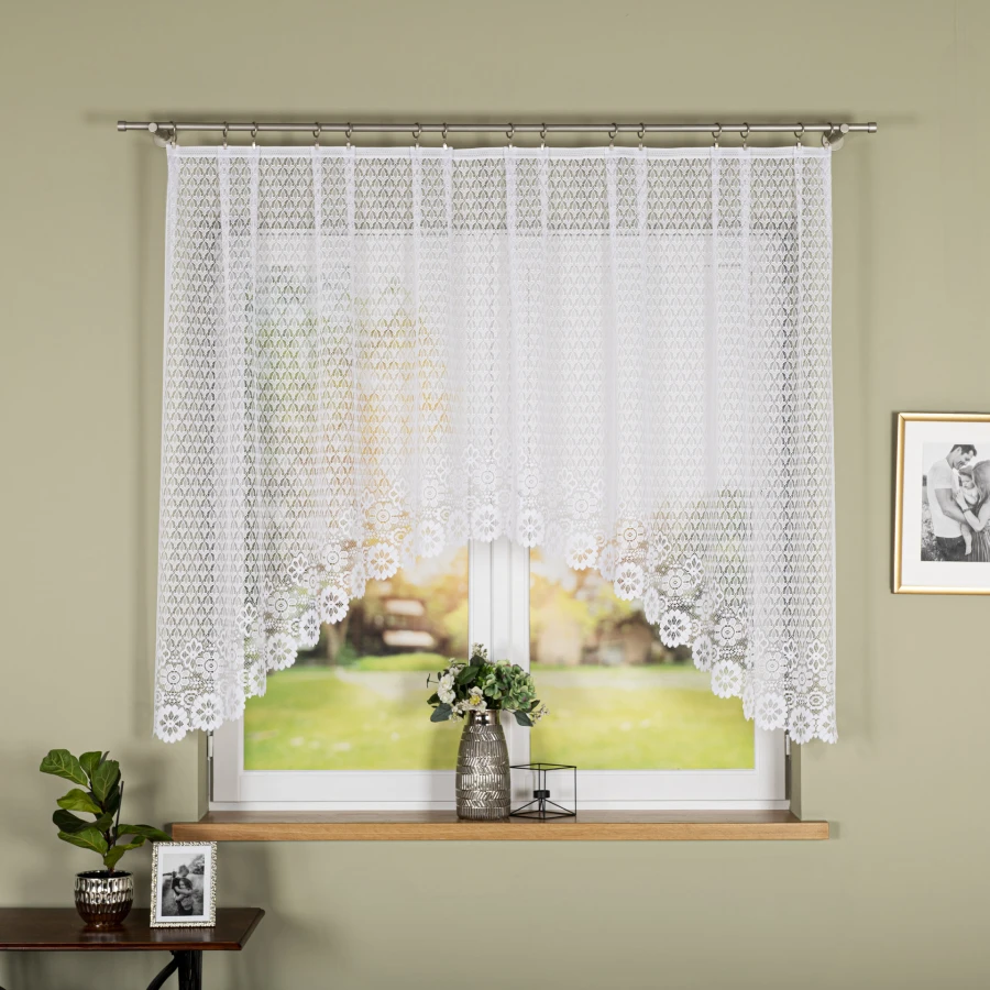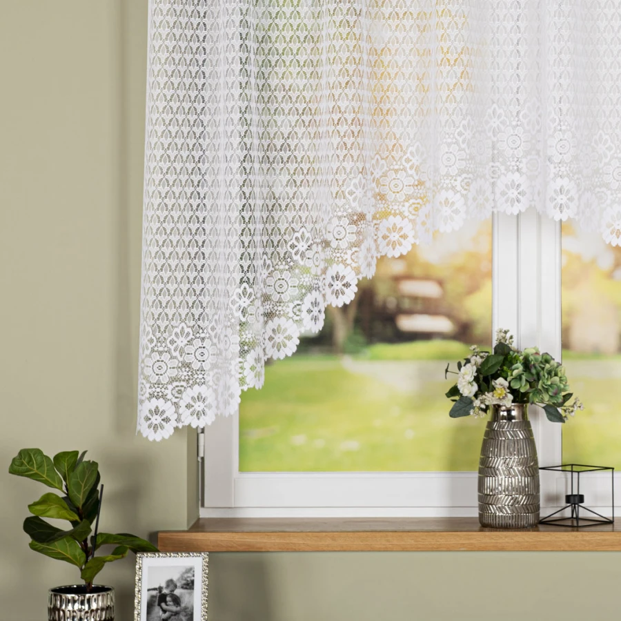 Dzięki uniwersalnej bieli i kwiatowemu wzorowi firanka dobrze prezentuje się w salonie, sypialni, jadalni oraz w kuchni. Rozmiar 250x140 cm i dekoracyjne podcięcie na dole szczególnie ładnie komponują się z klasycznymi karniszami i oknami, gdzie chcesz uzyskać lekki, jasny efekt.