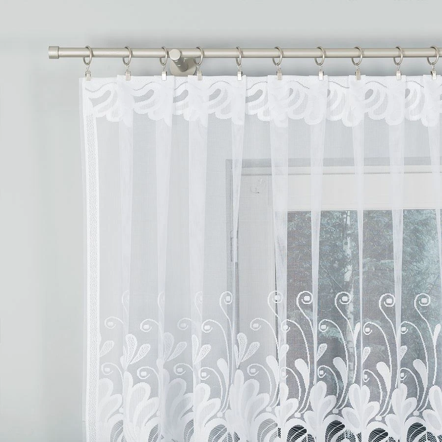 Biała firanka KASJANA będzie świetnym wyborem do salonu, sypialni, jadalni czy pokoju gościnnego – wszędzie tam, gdzie chcesz uzyskać jasny, uporządkowany efekt i delikatną dekorację okna. Klasyczny styl i ornamenty łatwo połączysz zarówno z tradycyjnymi meblami, jak i spokojnymi, nowoczesnymi dodatkami.
