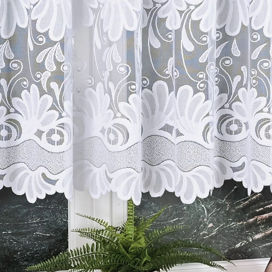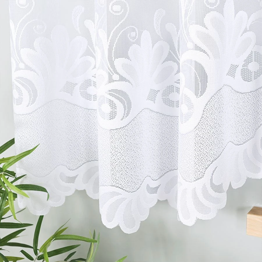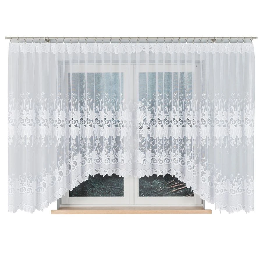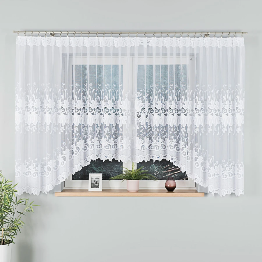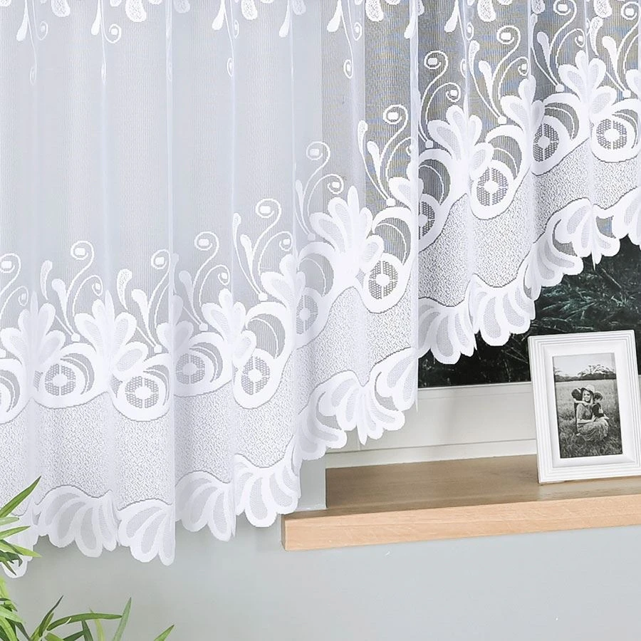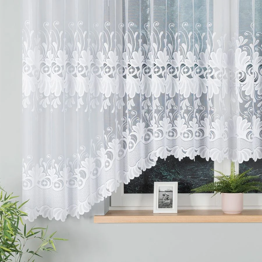 To klasyczna firanka w kolorze białym, wykonana z dzianiny żakardowej o gramaturze 80–90 g/m² (100% poliester). Rozmiar 500x160 cm sprawia, że firana stanowi gotową, efektowną dekorację okna, a sposób zawieszania na żabki ułatwia jej szybkie założenie. Wykończenie boków jest fabryczne (nie wymaga obszycia), a dół został wykonany techniką laserowego wytapiania, co podkreśla precyzję wzoru.