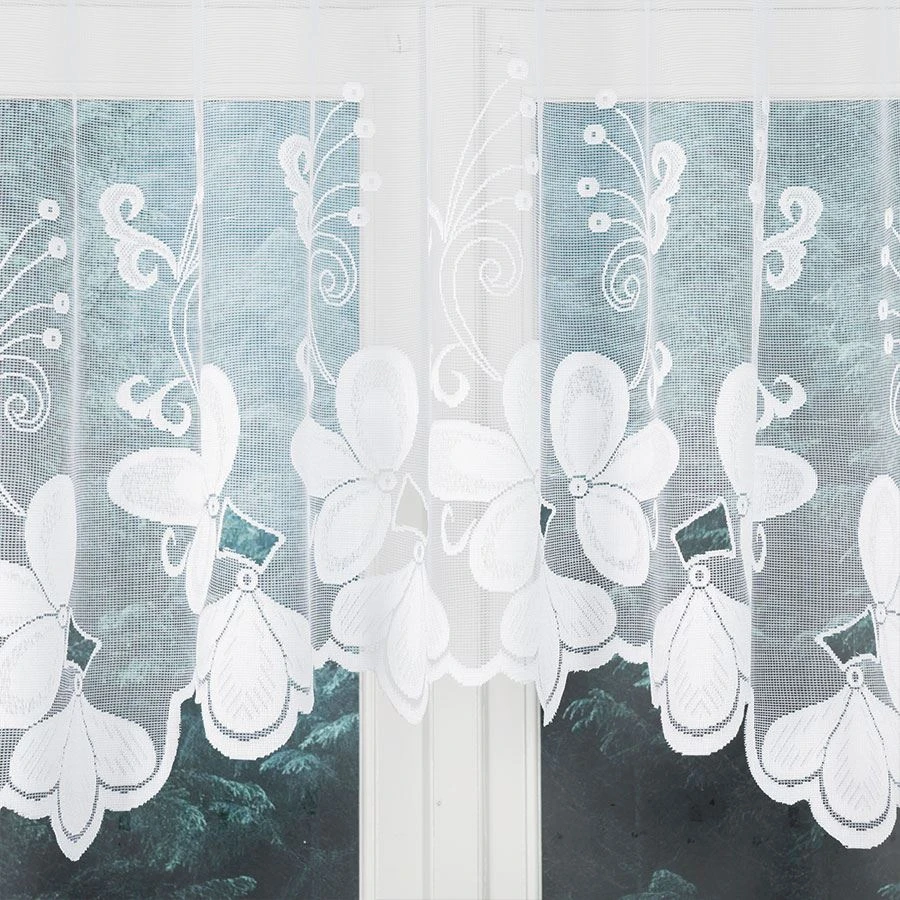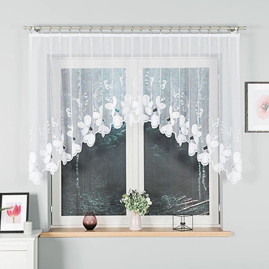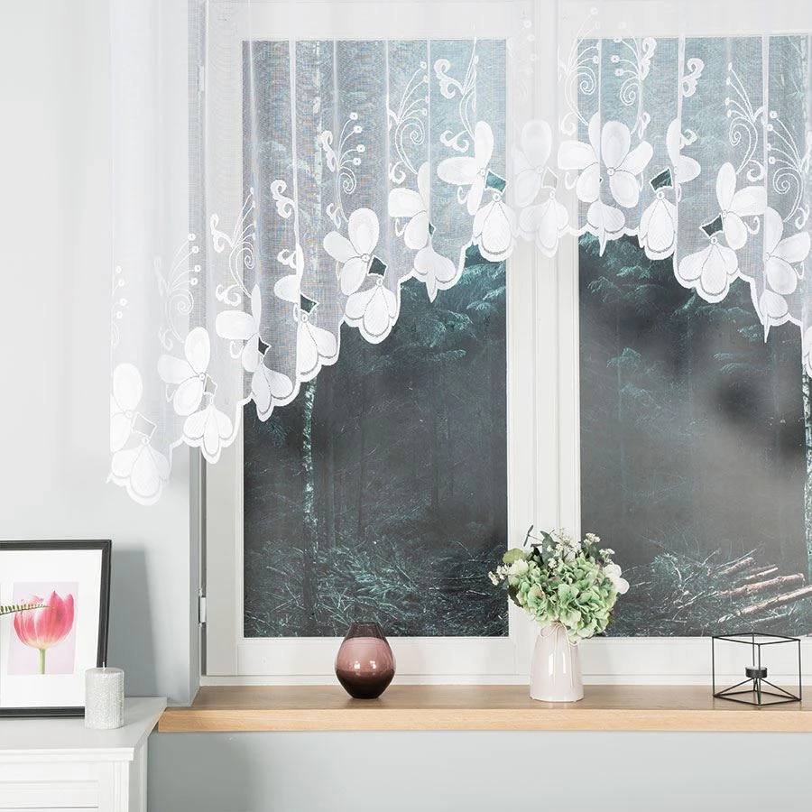 TEODORA sprawdzi się w salonie jako subtelna oprawa strefy dziennej, w sypialni jako delikatne dopełnienie klasycznego wystroju, a także w kuchni lub jadalni, gdzie liczy się jasność i lekkość aranżacji. Kwiatowy wzór i podcięcie dodają oknu charakteru, nie odbierając wnętrzu przestrzeni.