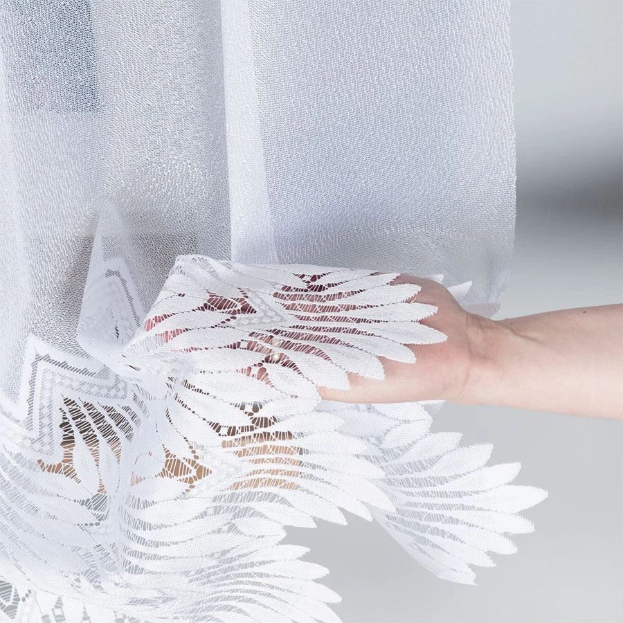 Model o wymiarach 350x160 cm jest firaną pojedynczą, wykonaną w 100% z poliestru o gramaturze 80–90 g/m². Firanka ma fabryczne wykończenie boków (nie wymagają obszycia) oraz górę bez taśmy, dzięki czemu zachowuje prostą, schludną formę. Dół wykończono metodą laserowego wytapiania, co podkreśla precyzję krawędzi i estetykę detalu. Zawieszenie na żabki pozwala szybko ją zamontować i łatwo dopasować ułożenie do karnisza.