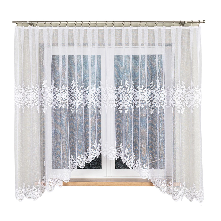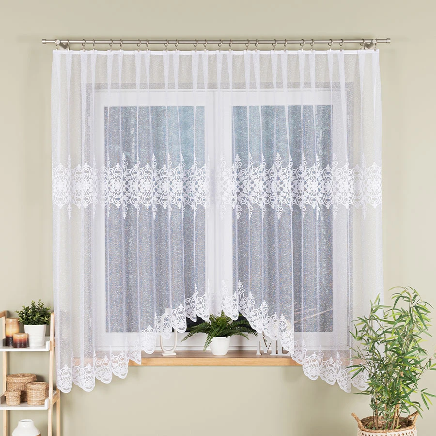 Firanka ŻANETA sprawdzi się jako dekoracja okna w pomieszczeniach, w których liczy się klasyczna forma i jasna kolorystyka. Biały żakard, ornamenty oraz falowane wykończenie dołu tworzą spójną i efektowną całość.