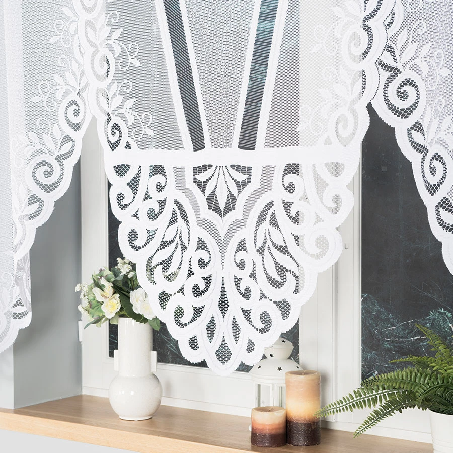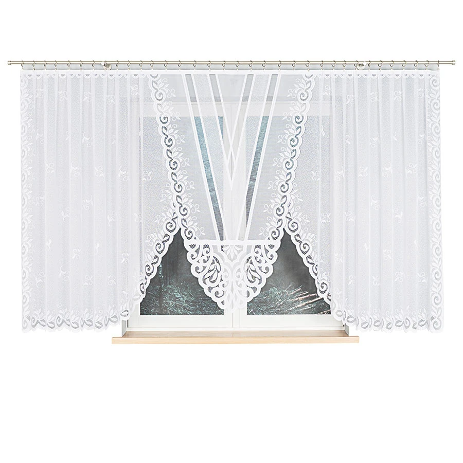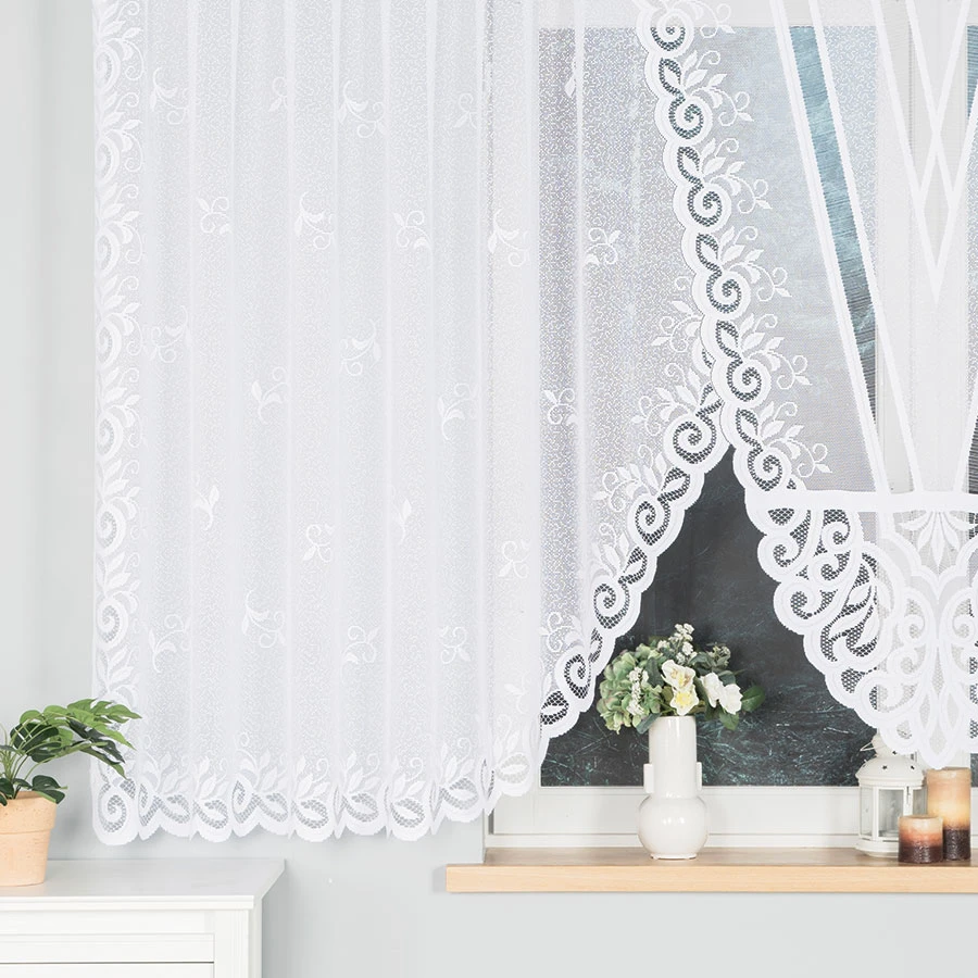 ROZALIA to firanka gotowa z podcięciem, wykonana z żakardu w białym kolorze. Model w rozmiarze 450x160 cm wyróżnia się klasycznym wzorem oraz dekoracyjną, falowaną bordiurą u dołu, co dobrze widać na zdjęciu. Tkanina o gramaturze 80–90 g/m2 została wykonana w 100% z poliestru. Firanka ma fabrycznie wykończone boki, które nie wymagają obszycia, oraz górę bez taśmy.
