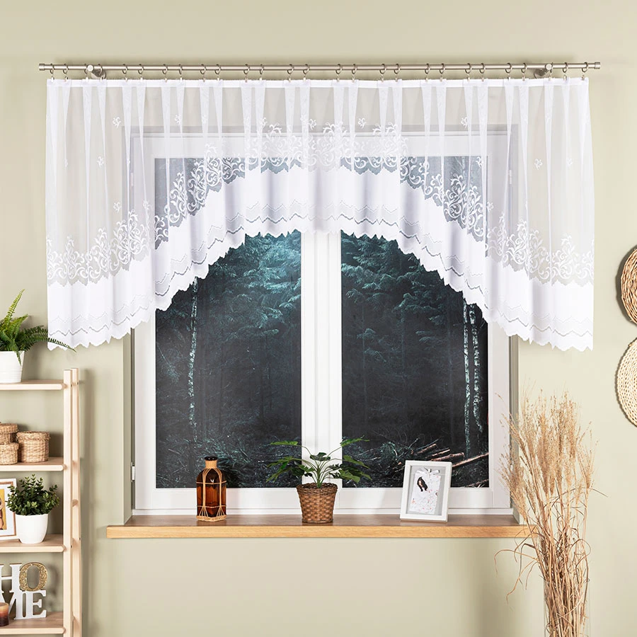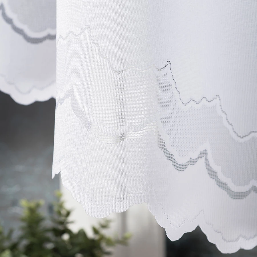 - Dekoracyjny dół – bordiura falowana podkreśla linię firanki i nadaje jej ozdobny wygląd.