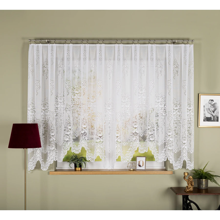 ADELA to biała firanka gotowa z podcięciem, wykonana z żakardu i ozdobiona kwiatowym wzorem. Rozmiar 400x160 cm sprawia, że model dobrze prezentuje się na szerszych oknach, tworząc lekką i dekoracyjną oprawę. Dół wykończony falowaną bordiurą podkreśla wzór i nadaje całości estetyczny wygląd. Firanka została przygotowana do zawieszenia na żabkach, a fabrycznie wykończone boki nie wymagają obszycia. To praktyczne rozwiązanie dla osób, które szukają gotowej firanki w klasycznym stylu.
